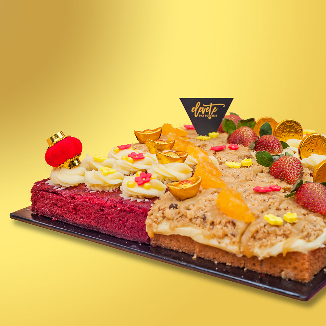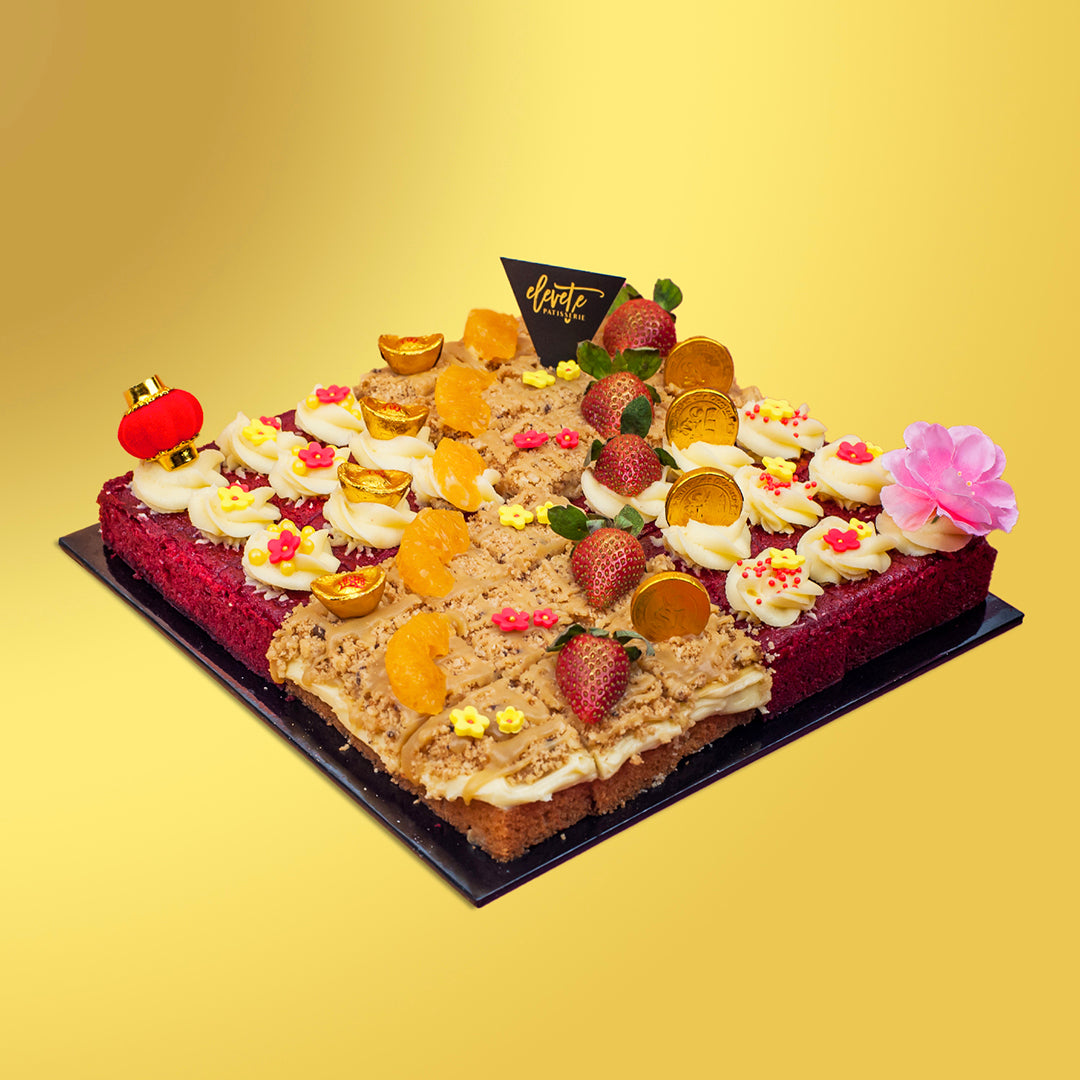 Why get cookies when you can have cake that tastes as good as one! A combination of our classic Butterscotch Cookies Cake Bites and a rare feature of our Red Velvet Cake Bites dressed for the occasion with candied mandarin oranges, fresh strawberries & ingot-shaped chocolate.