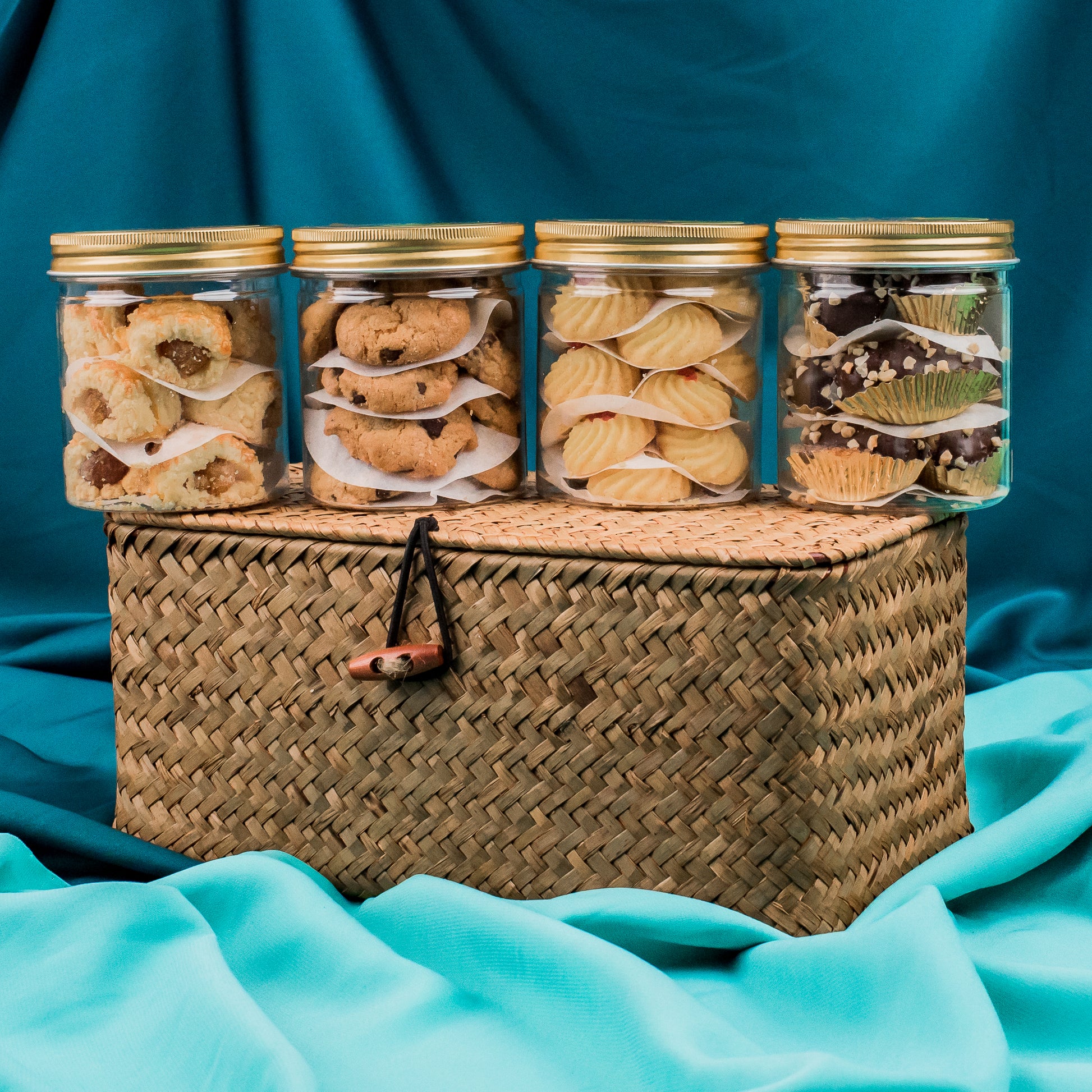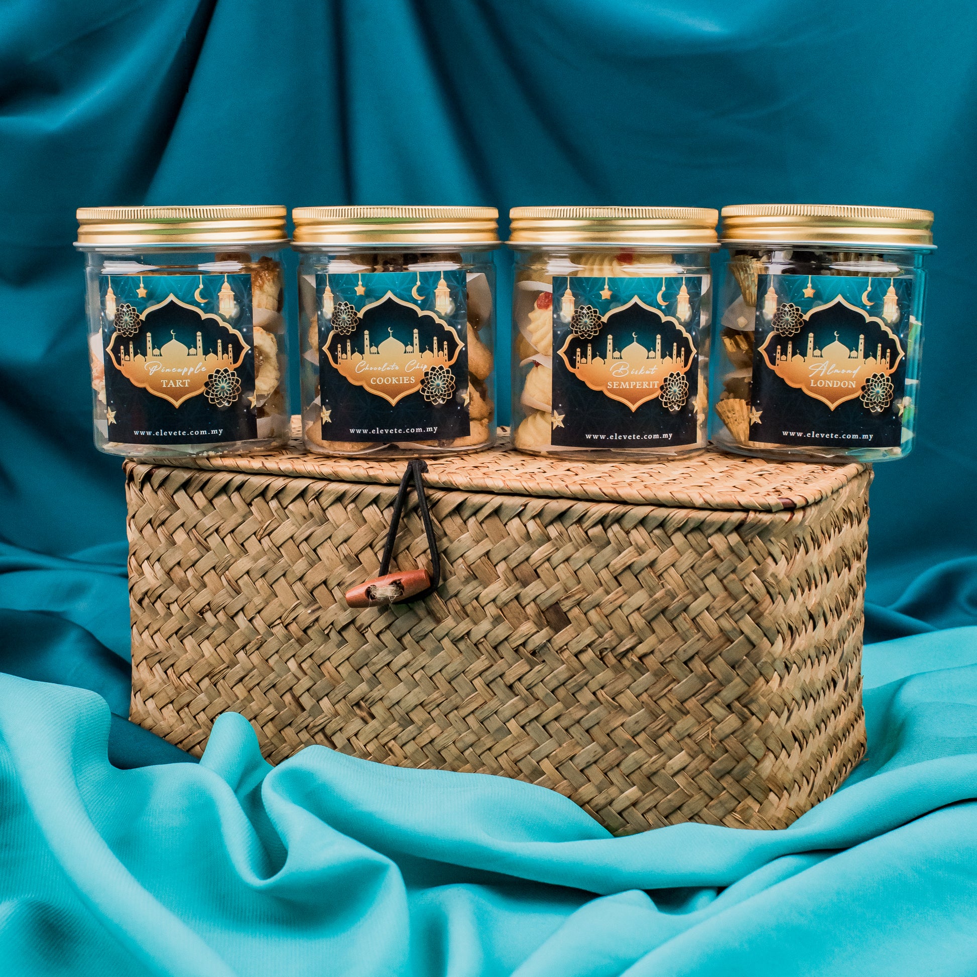 Hari Raya is all about getting together with your family and friends. Besides preparing delicious festive dishes, have the Buah Tangan as a Raya gift to warm your guests’ hearts. “Buah Tangan” means souvenirs in Malay. Comes in a rattan basket of four jars, your guests will surely be delighted by this combo of Elevete’s Pineapple Tart, Semperit cookies with cherries, Chocolate Chip Cookies and Almond London.