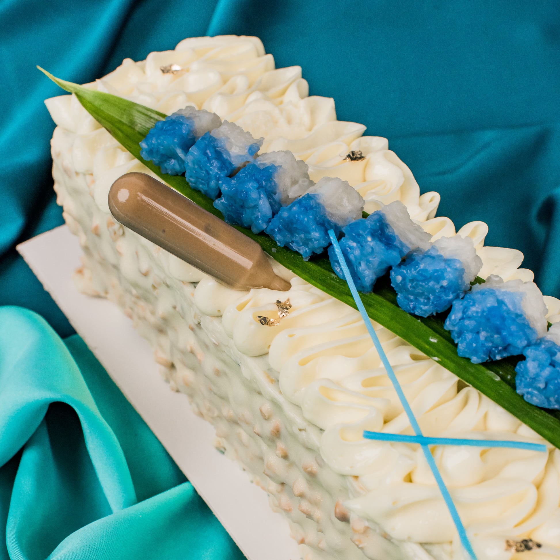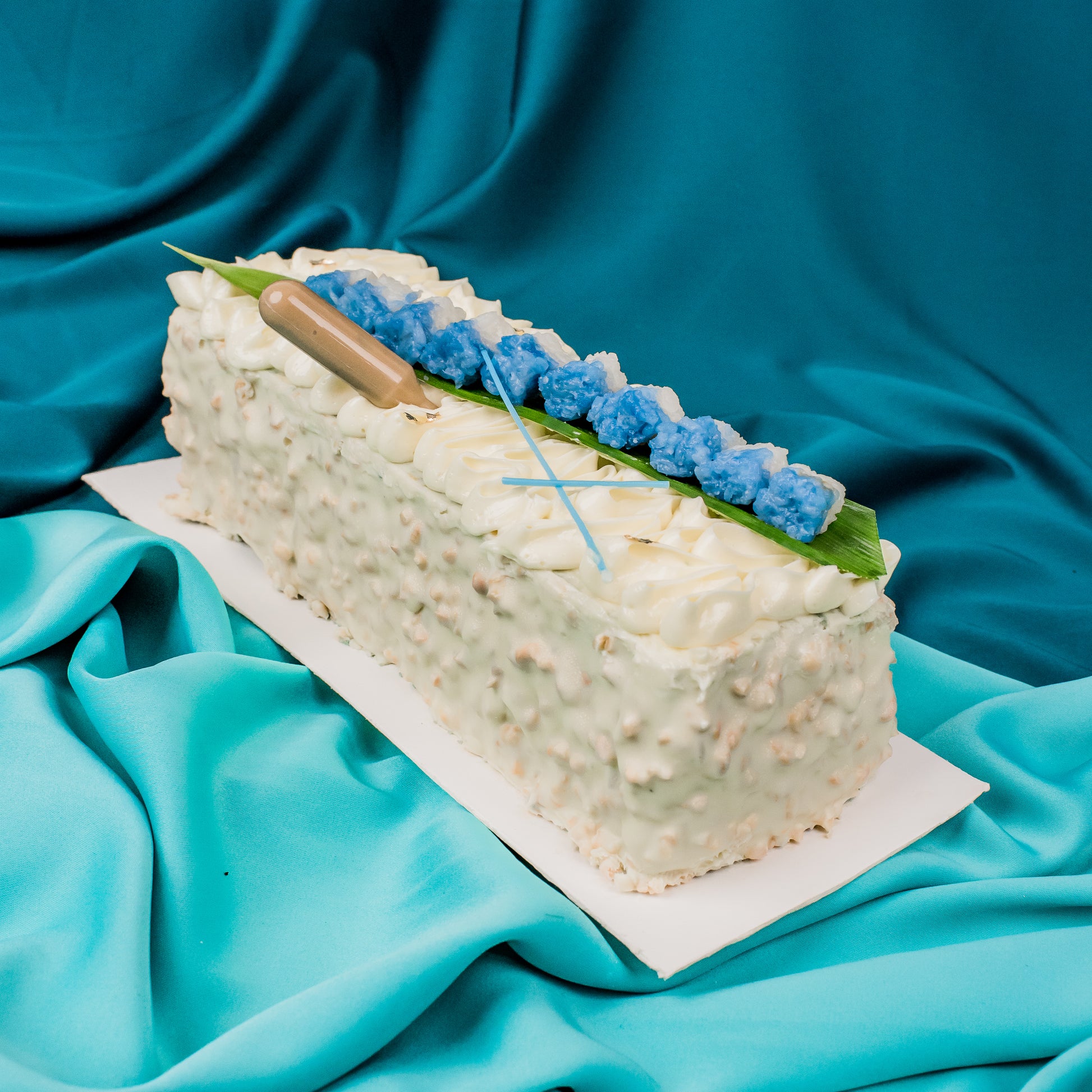 Looking for something new? Try out the Bunga Telang Bar, a cake version of the chef's favourite kuih – Pulut Tai Tai. Inspired by it, this cake bar is layered with modern sous vide kaya, pulut tai tai and light coconut buttercream.