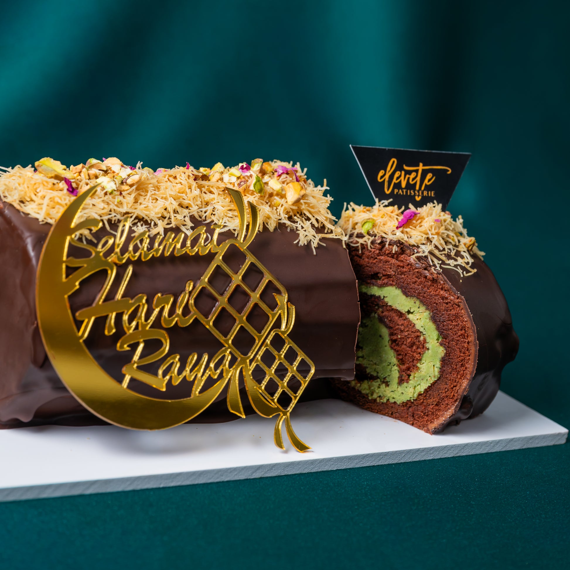 Our Chocolate Pistachio Kunafa Roulade layers a soft chocolate chiffon sponge with a rich pistachio kunafa filling, finished with a glossy chocolate glaze. It’s nutty, chocolatey, and just the right amount of “wow”, whether you’re serving it after iftar, bringing it for Raya visiting, or keeping it in the fridge for your own late-night slice.