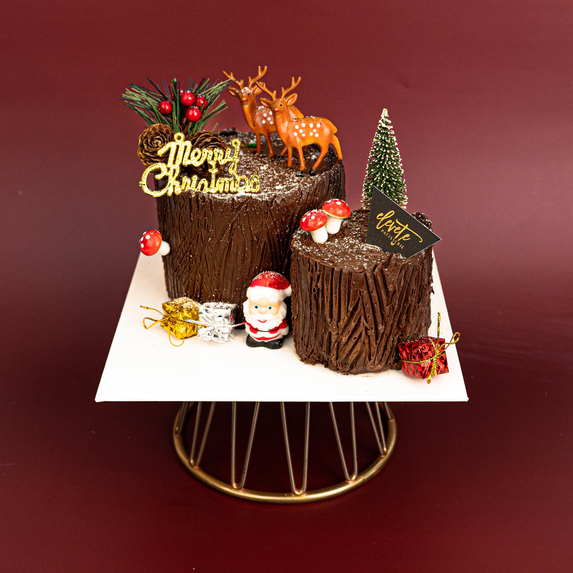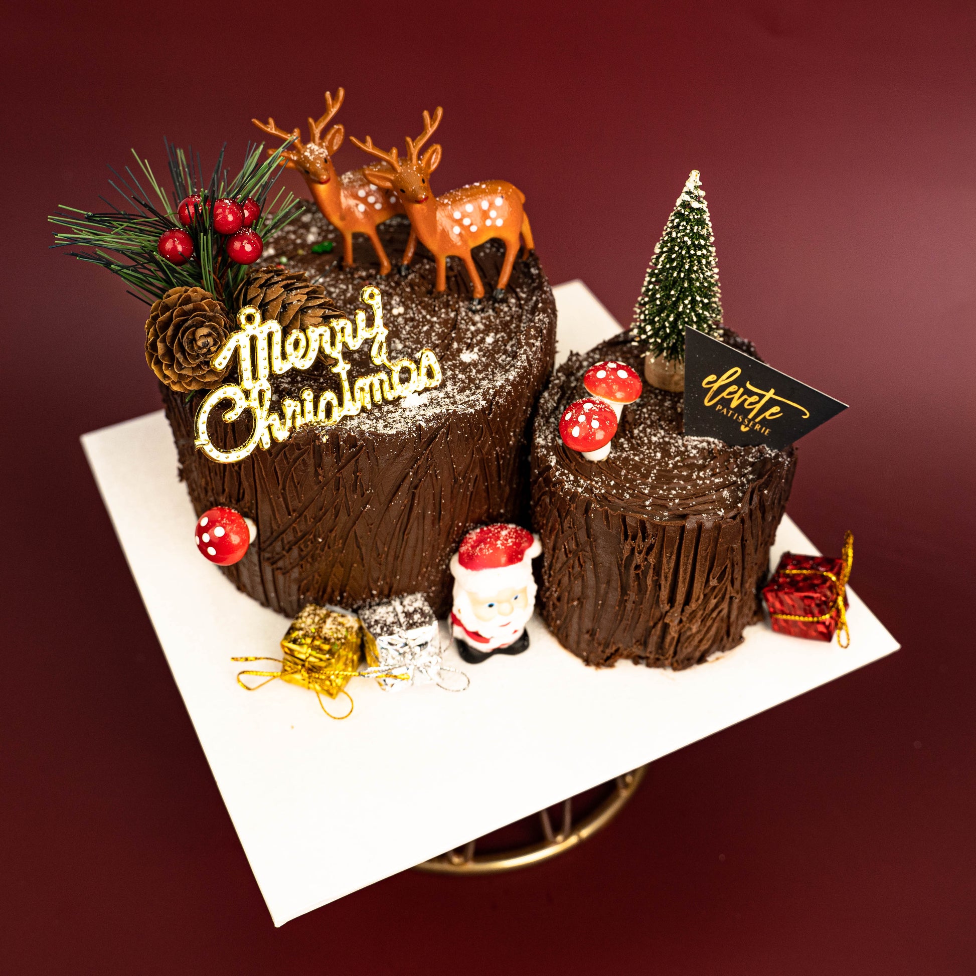 No Christmas celebration is complete without the traditional Bûche de Noël ! This year is no different, With a slightly changed design for this year's holiday season, we're bringing back this recipe that brought us great feedback over the past years - a Moist Chocolate Cake with Elevete's Signature Salted Caramel buttercream rolled, covered with rich dark couverture chocolate frosting.