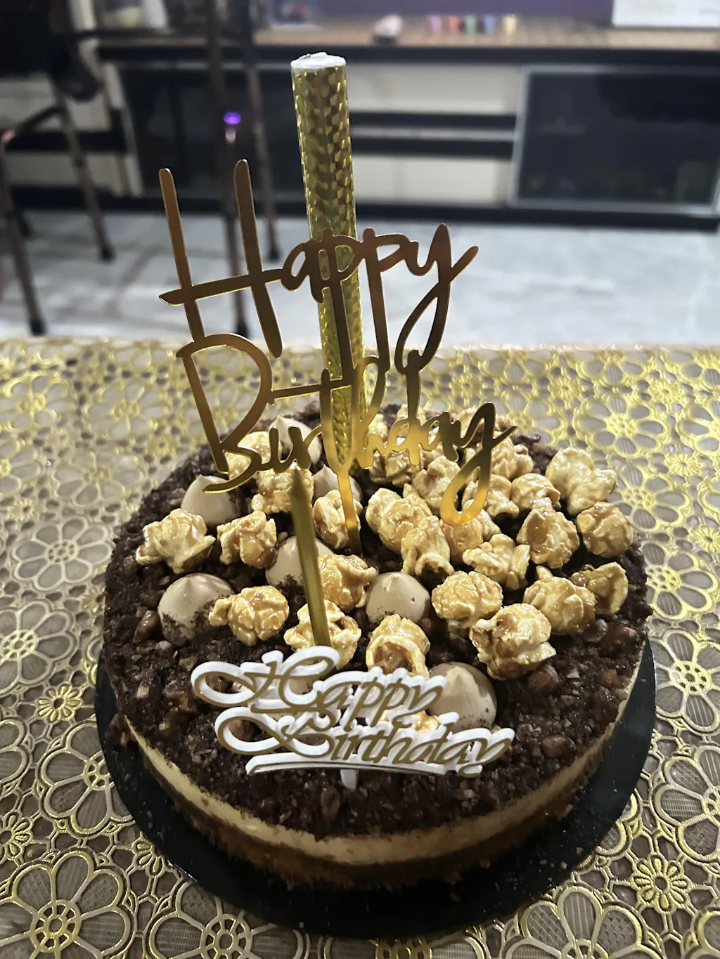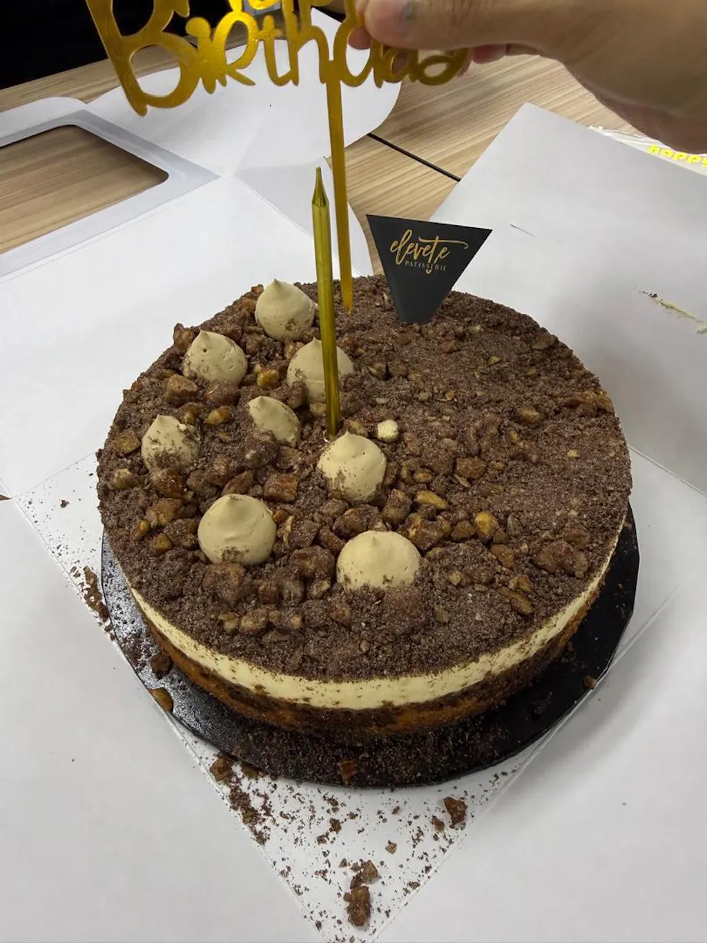 Wheatless gluten free coconut sponge cake topped with mascarpone cheese and aromatic coffee buttercream frosted with cocoa almond praline toppings.