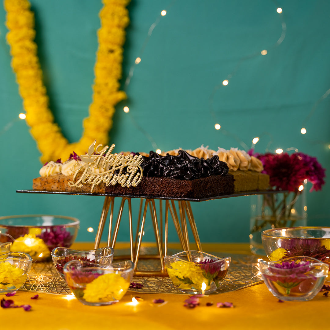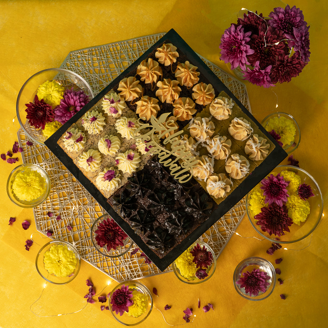 Celebrate the Festival of Lights with our Divine Diwali Bites! This treat box is a special Diwali-themed gift wrap that offers our well loved and delightful Mix & Match Cake Bites.