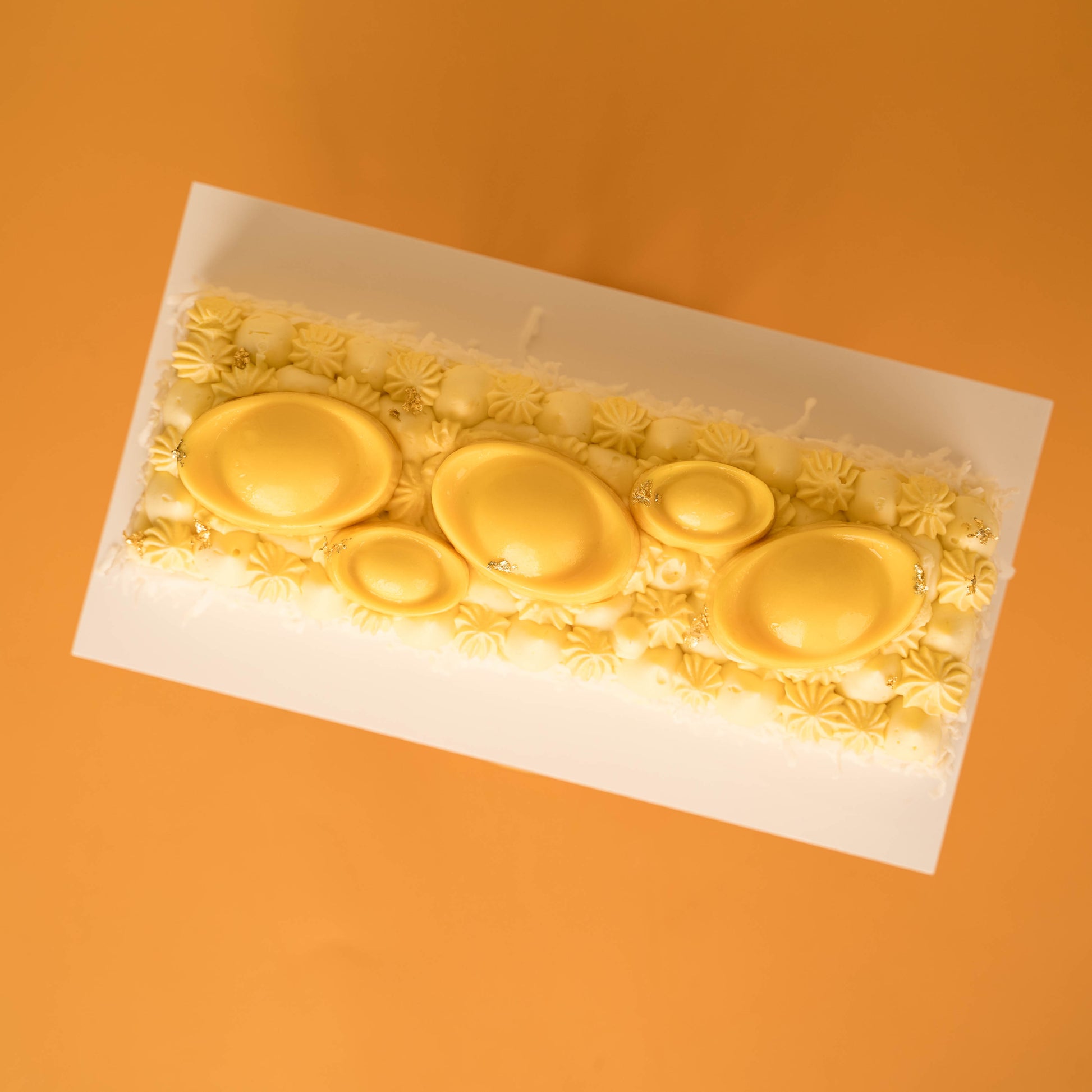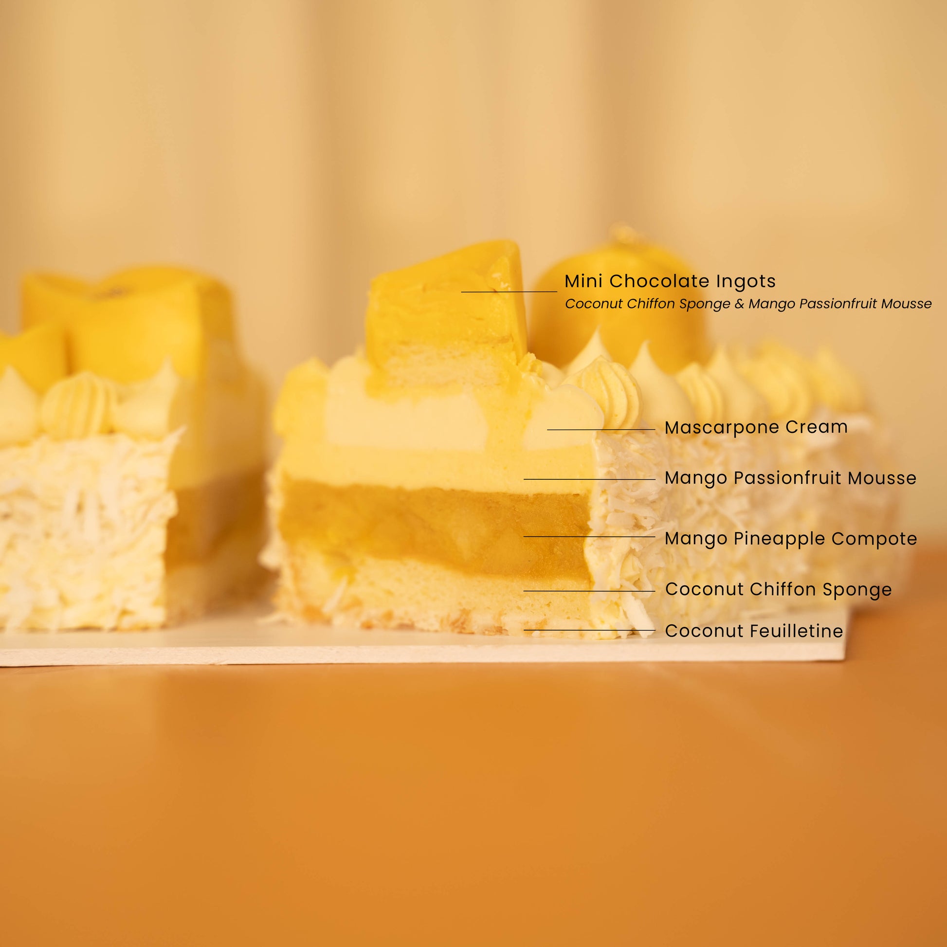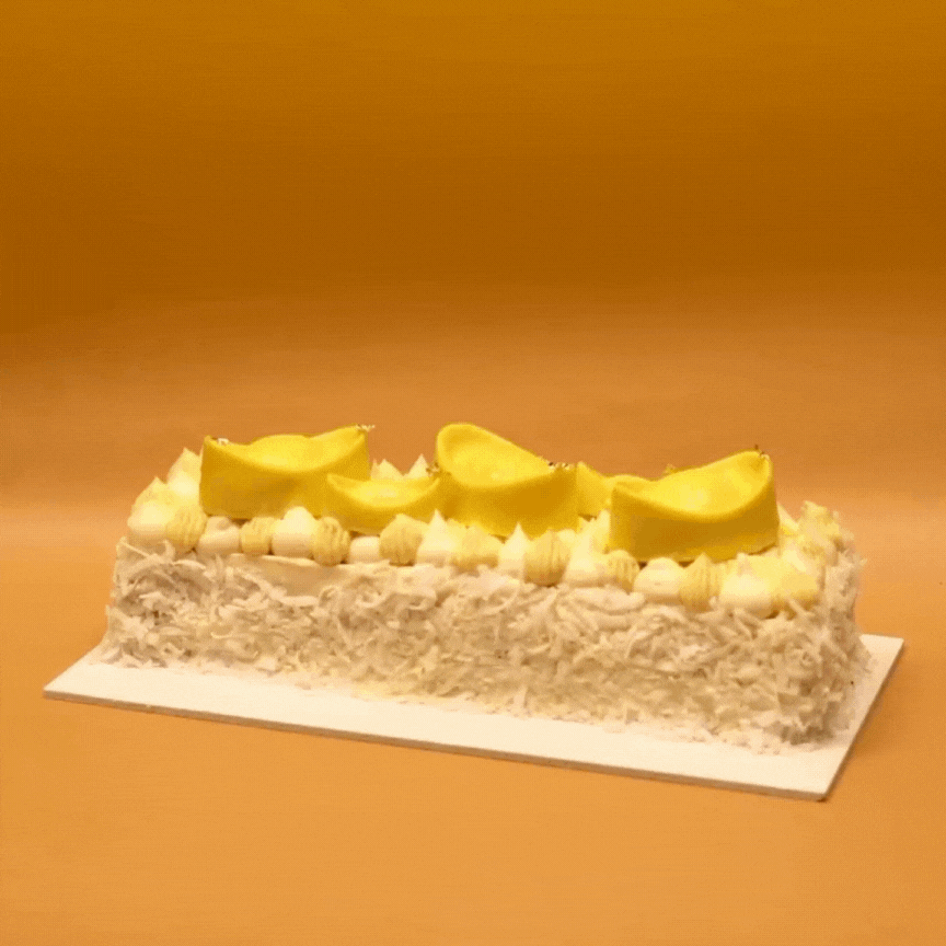 Decorated with mini ingots that not only serves as an auspicious symbol of good fortune, it is also a teaser treat of the tropical treasure it sits upon - a crisp coconut feuilletine base with a light coconut chiffon sponge paired with the complimentary tropical flavours of a vibrant pineapple mango compote and a velvety mango passionfruit mousse coated with Hawaiian coconut flakes. The mini ingots consist of a coconut chiffon sponge base coated with white chocolate and a filling of mango passionfruit mousse.