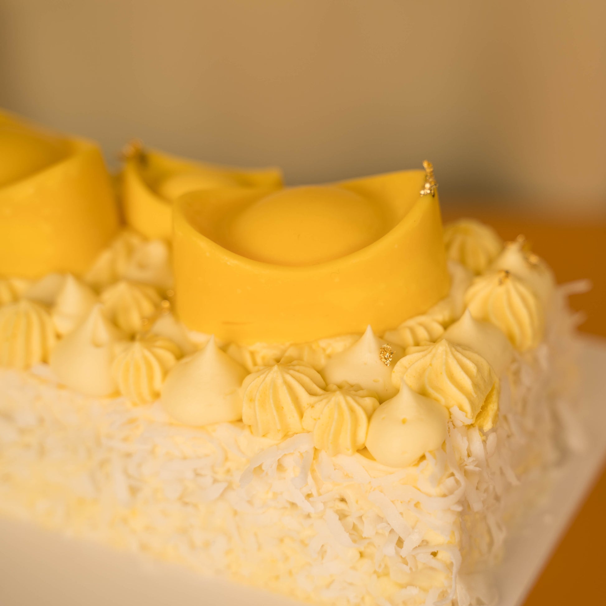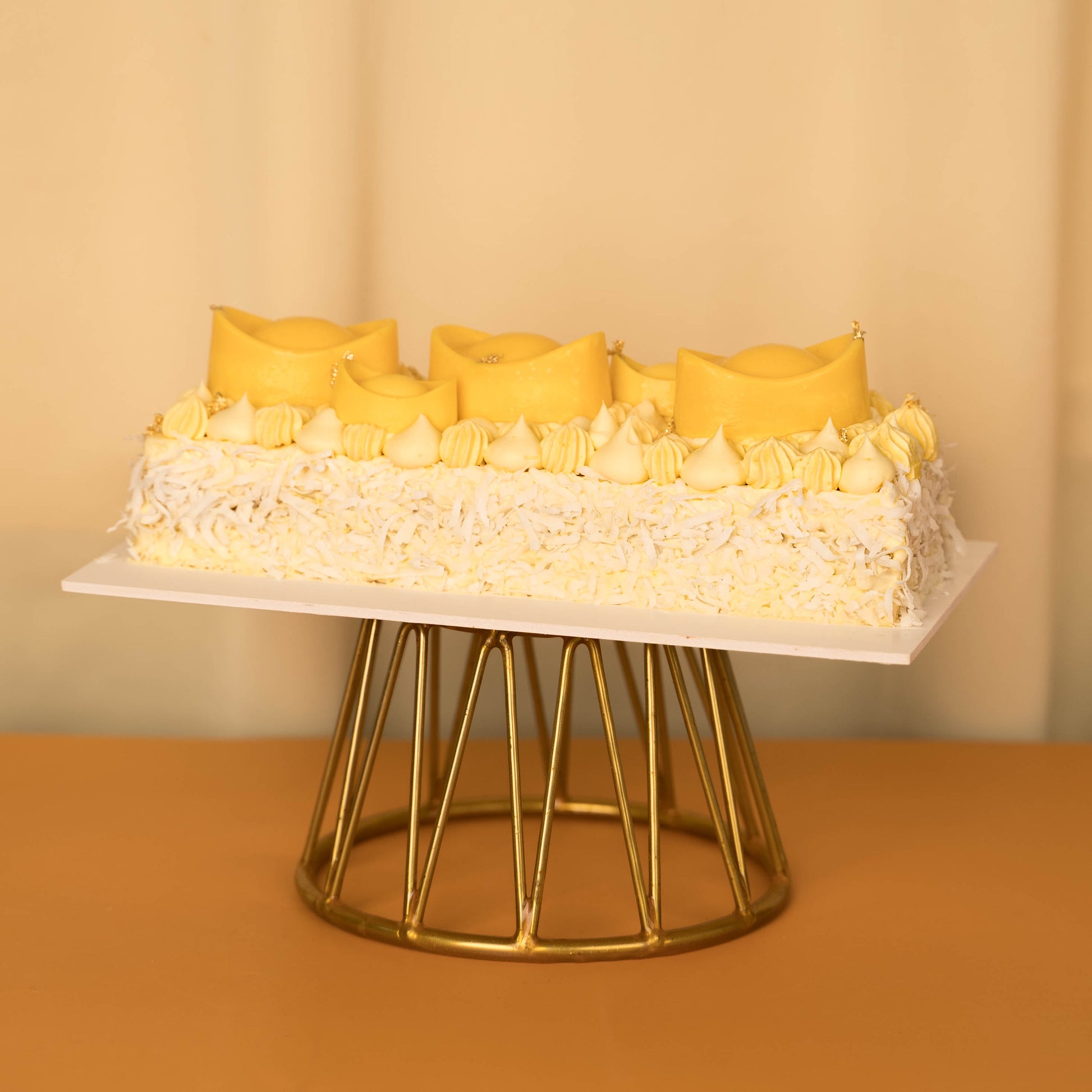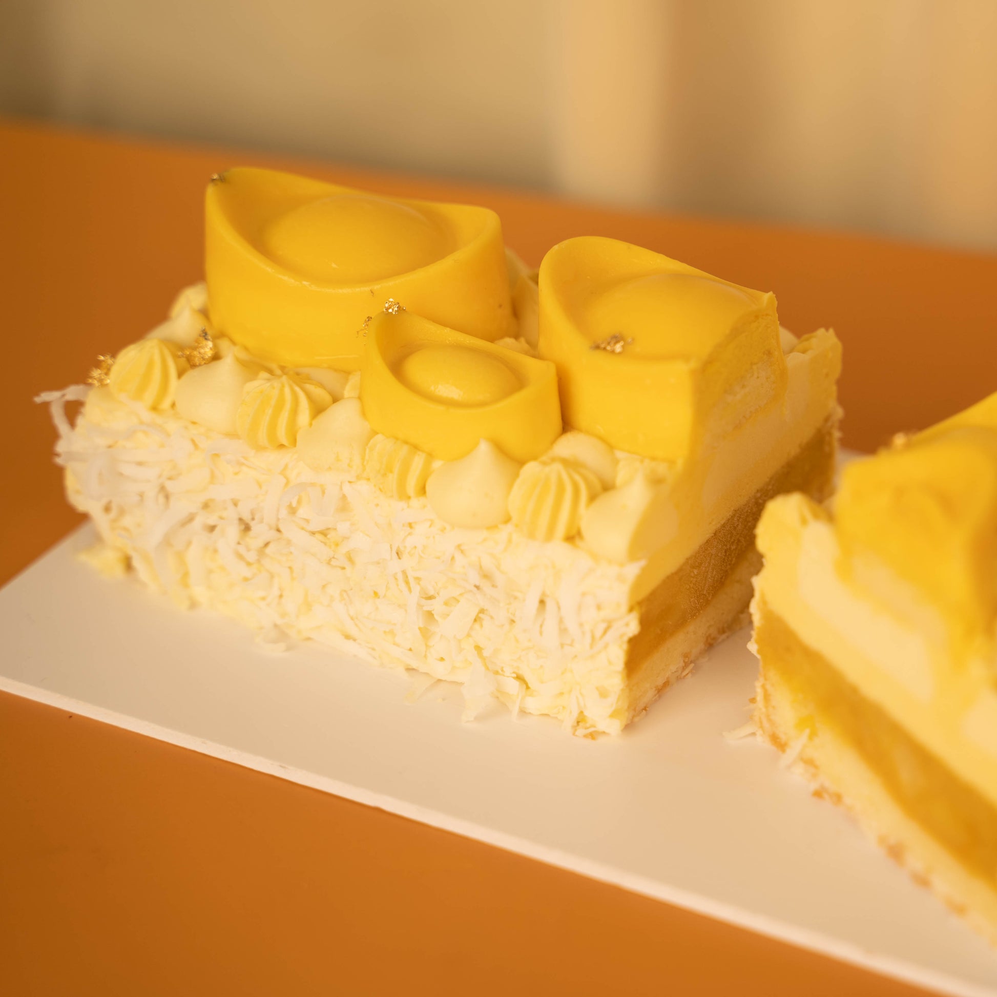 Decorated with mini ingots that not only serves as an auspicious symbol of good fortune, it is also a teaser treat of the tropical treasure it sits upon - a crisp coconut feuilletine base with a light coconut chiffon sponge paired with the complimentary tropical flavours of a vibrant pineapple mango compote and a velvety mango passionfruit mousse coated with Hawaiian coconut flakes. The mini ingots consist of a coconut chiffon sponge base coated with white chocolate and a filling of mango passionfruit mousse.