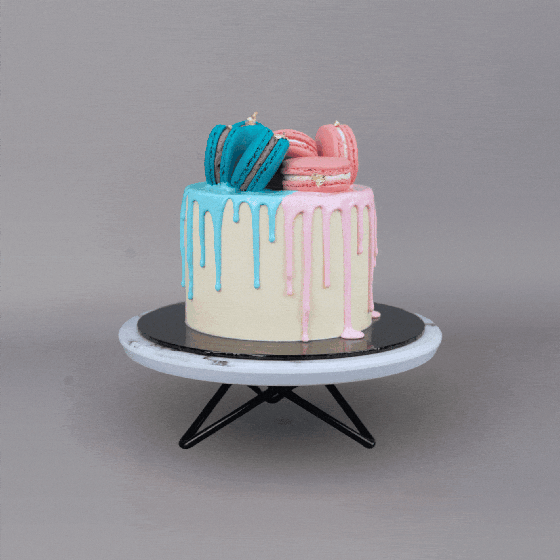 This gender reveal cake is a confectionery creation that conceals the baby's gender until it's time for the big reveal! The exterior of the cake is covered in smooth buttercream frosting and beautiful dual-coloured chocolate drips, to enhance the much-awaited mystery: BOY OR GIRL?