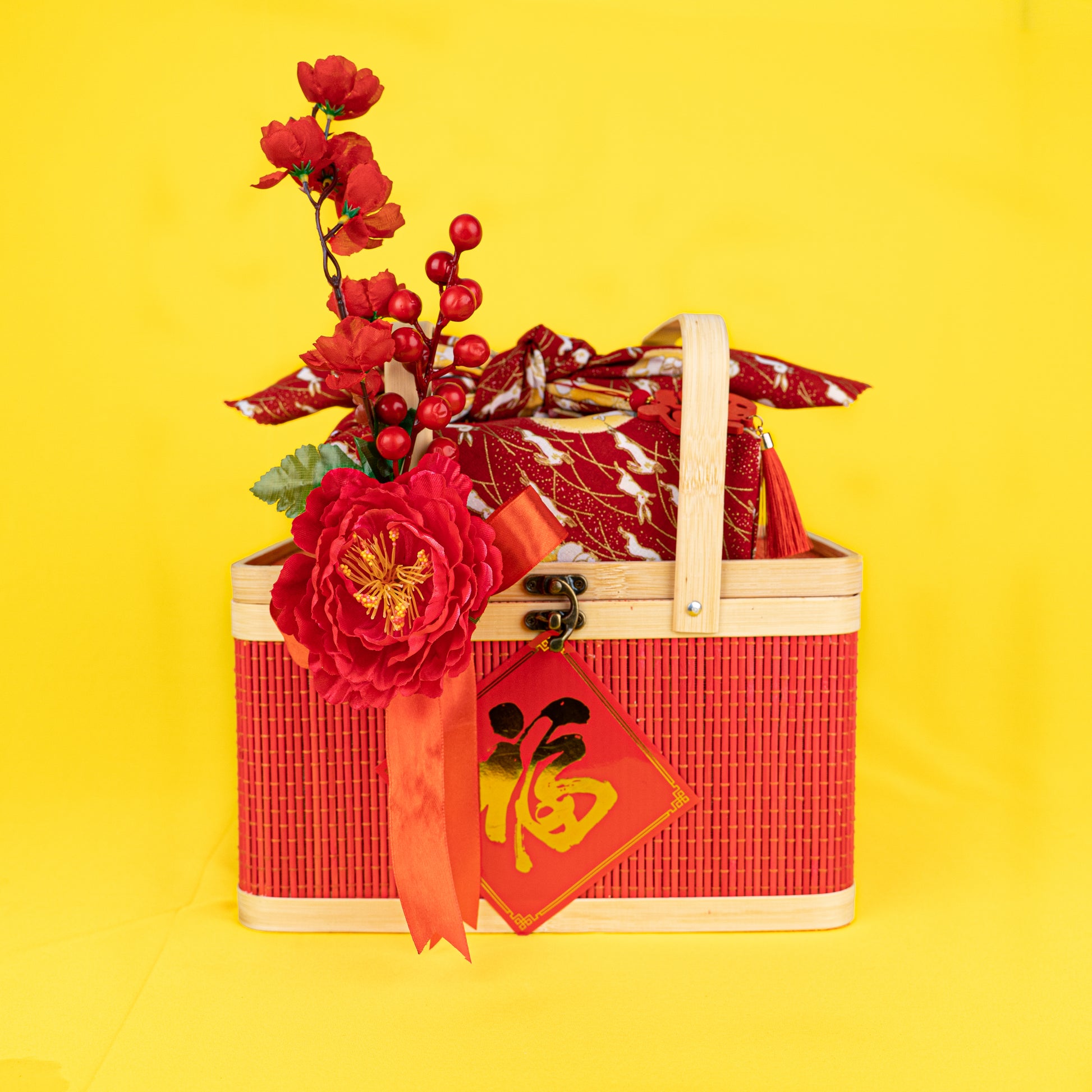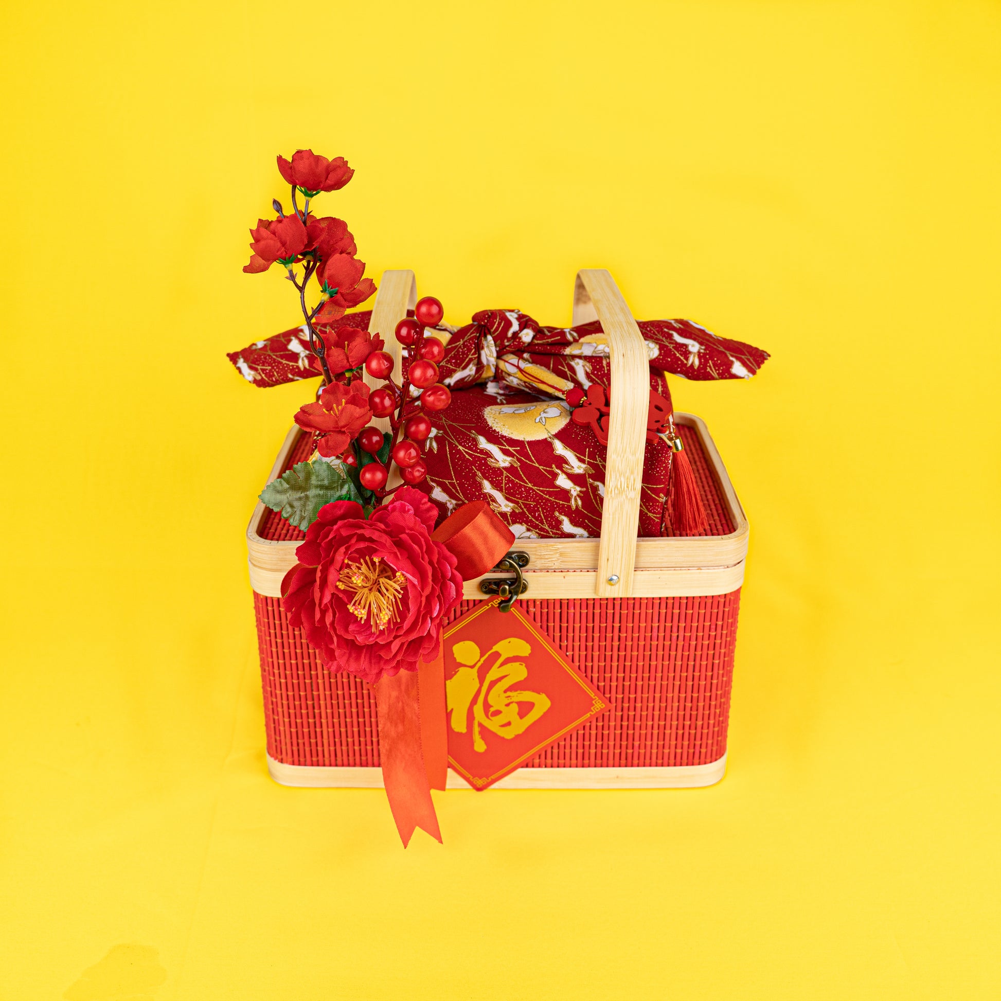 "Elevete" your CNY gifting with our Gift of Fortune | 新春旺来 . We've included complimentary Mandarin oranges to complete the gesture to bring about good fortune and prosperity for the coming year. This gift set is packaged in a vibrant bamboo basket with decorative ornaments, accompanied with the pineapple tarts gift-wrapped in a reusable furoshiki cloth.