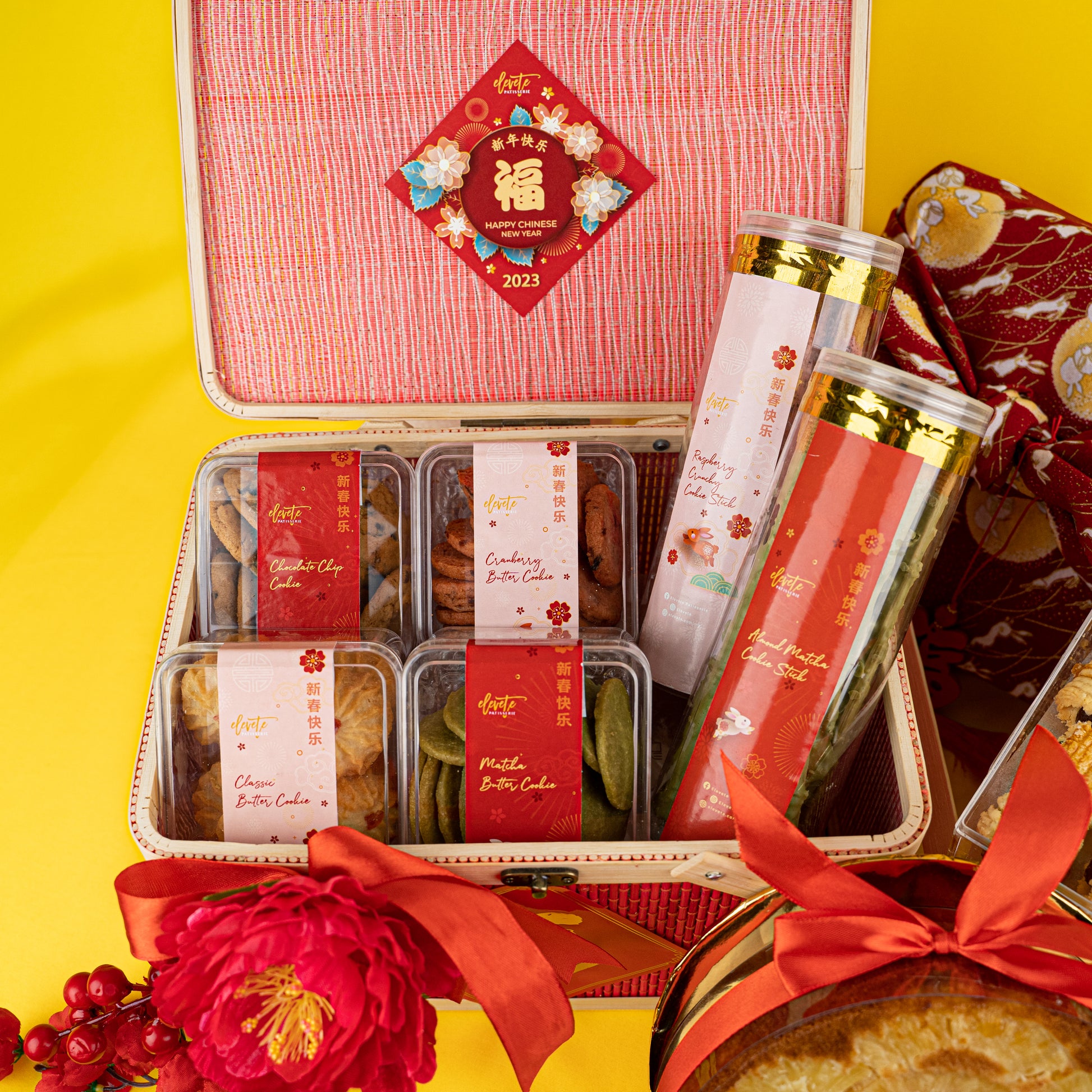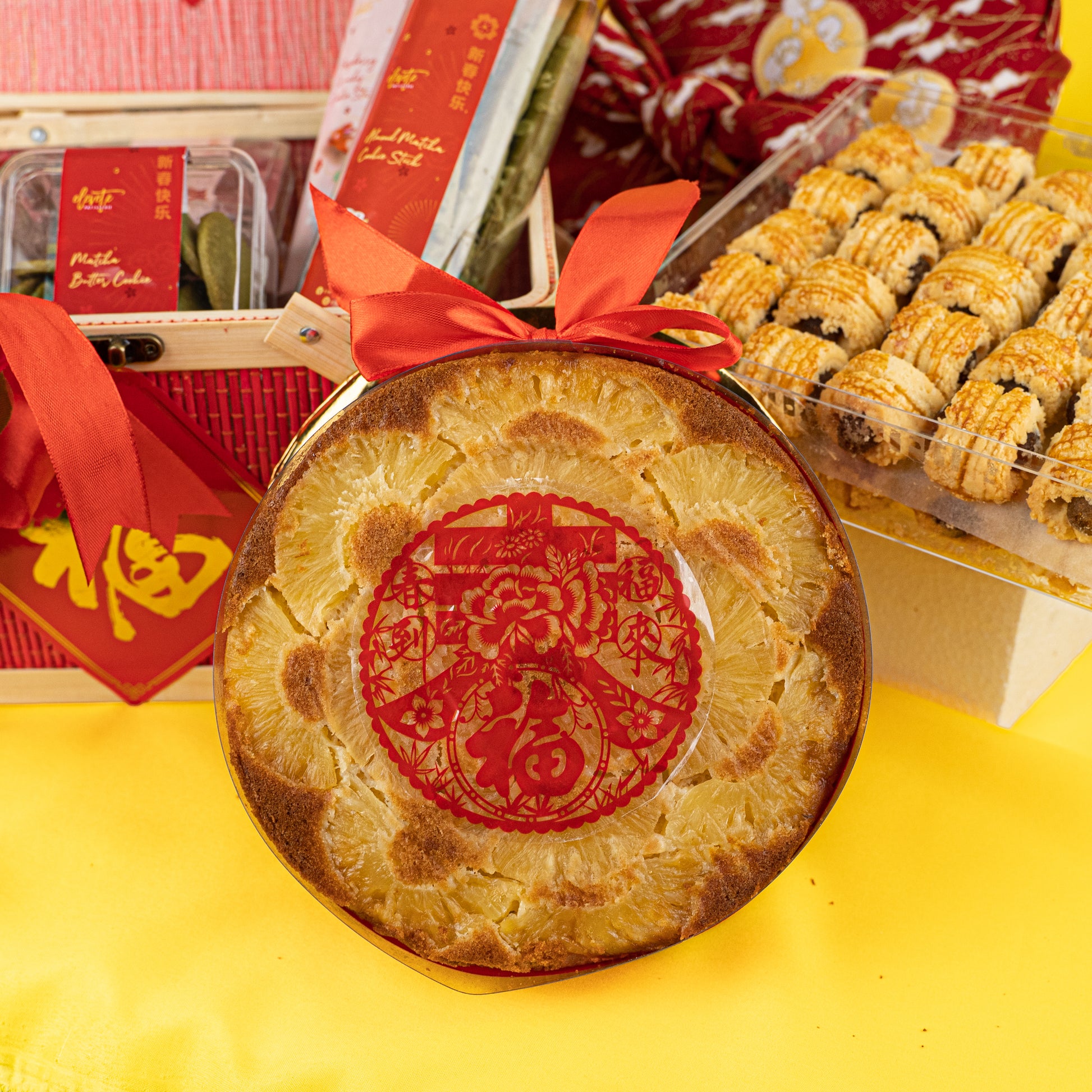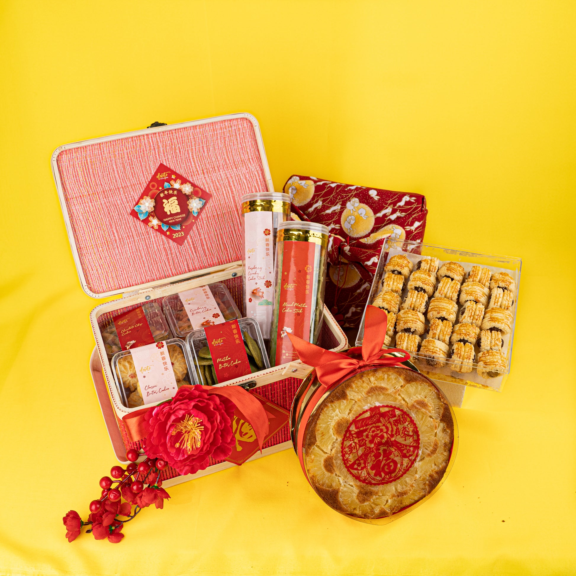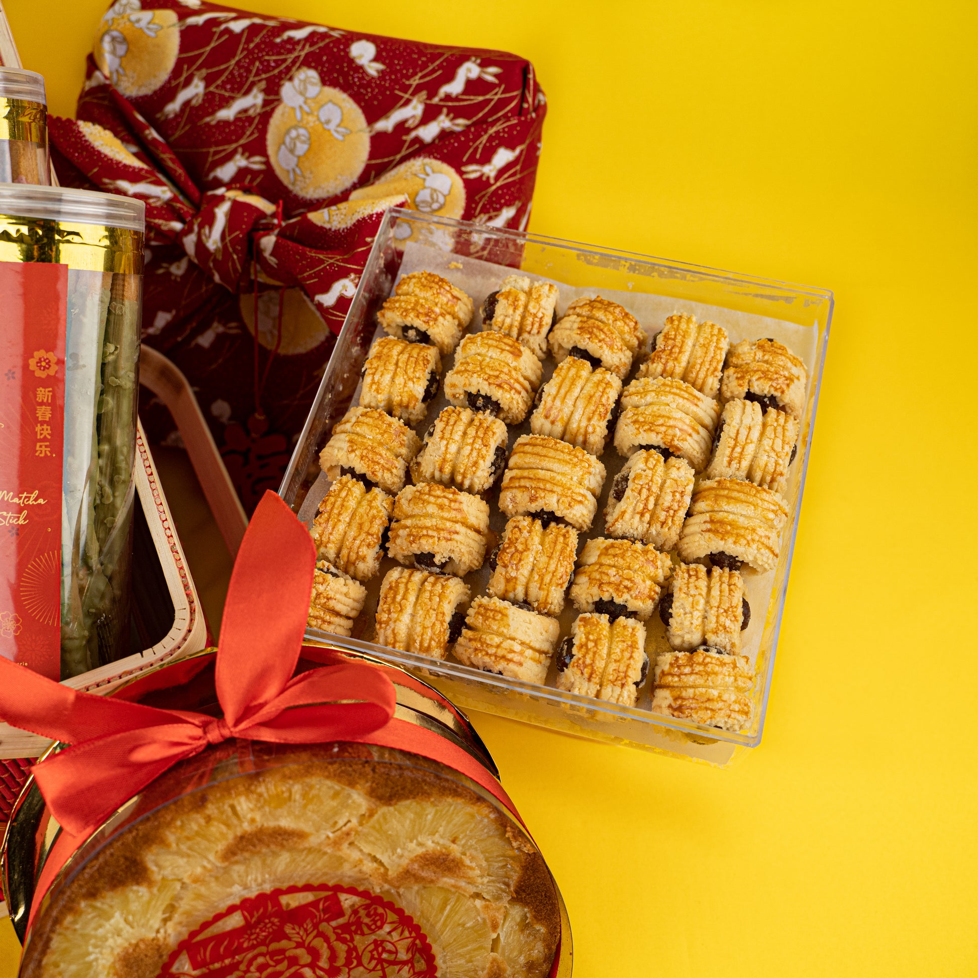 Features a 7 inch Prosperity Pineapple Cake (900g), a generous serving of our Signature Pineapple Tarts (50 pieces) and an assortment of delectable cookies. We can't wait for you to get your taste buds snacking on our Raspberry Crunchy Cookie Sticks & Almond Matcha Cookie Sticks. Enjoy yourself an elevated version of the infamous Pepero / Pocky sticks, handmade with premium ingredients.