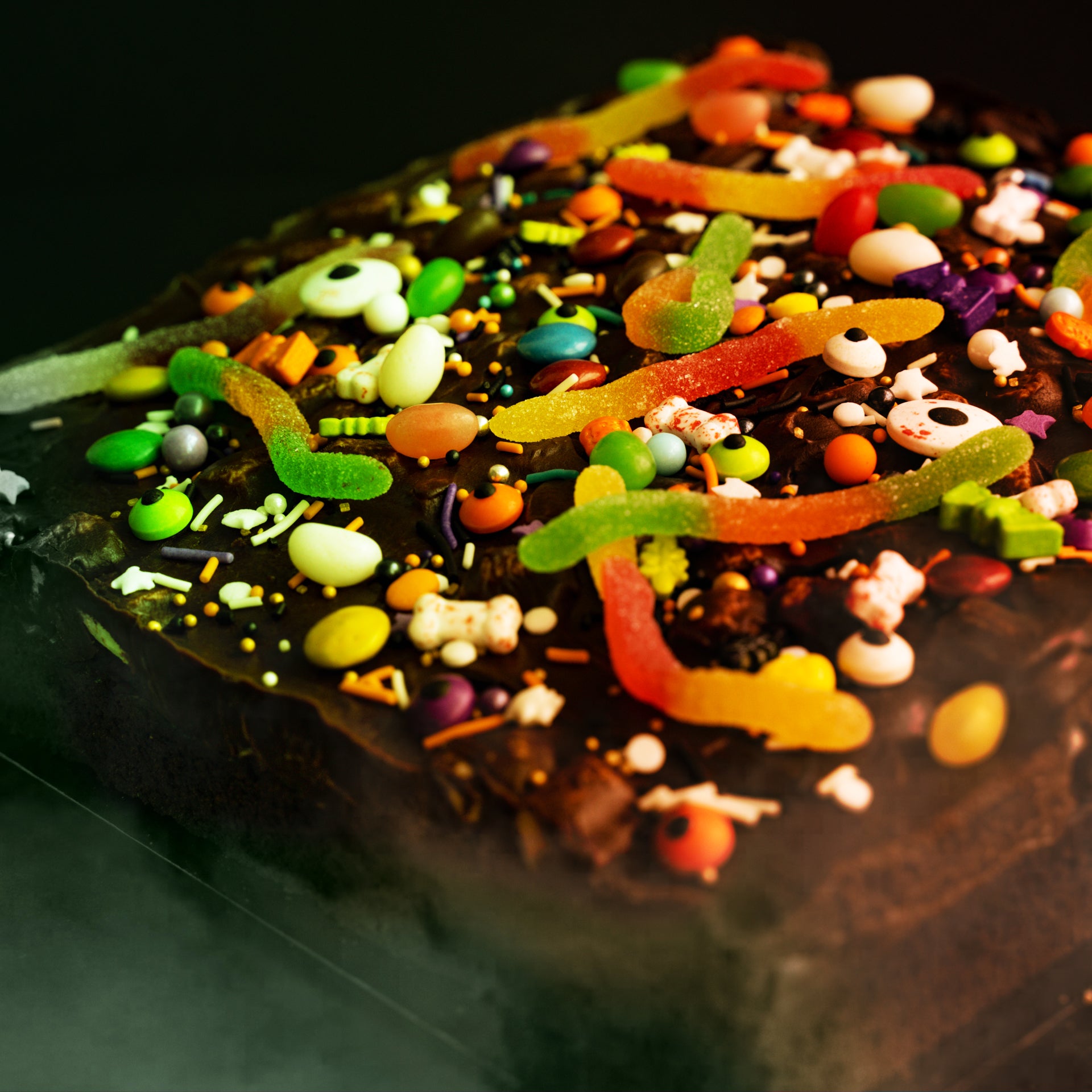 | Ingredients : | Dairy, Cocoa Powder, Vanilla, Eggs, Flour, Butter, Callebaut Dark Chocolate, Marshmallow, Candy worms and sprinkles |