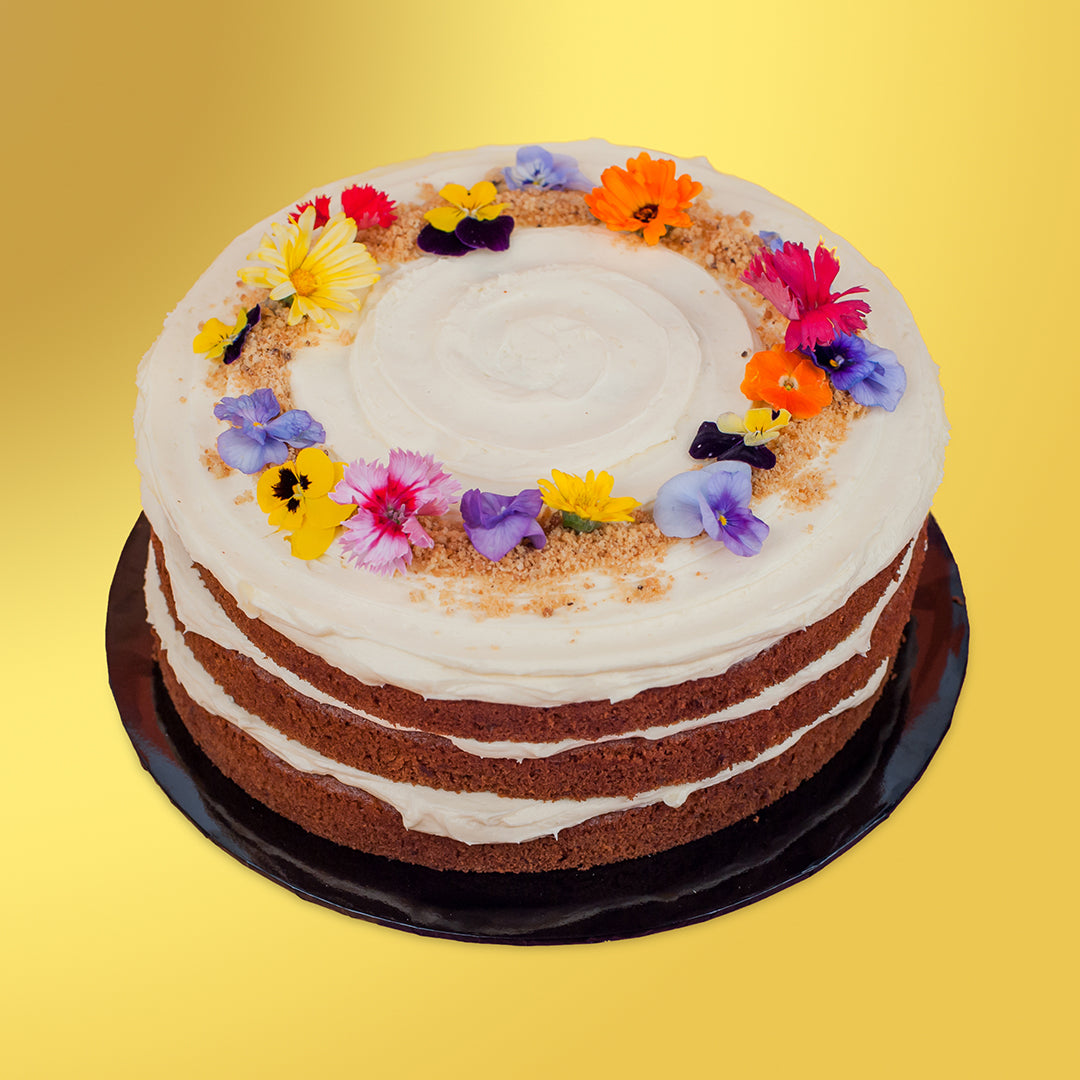A fragrant banana and pineapple cake with toasted walnuts and hints of cinnamon spices, served with a luxurious spread of classic cream cheese frosting decorated with colorful edible flowers!