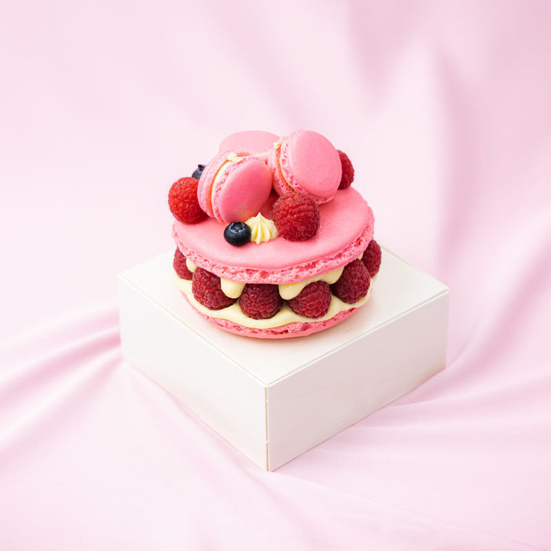 A macaron cake inspired by Pierre Herme. A 5 inch wide crunchy macaron cookie with a soft finish, envelops an refreshing filling made from a beautiful combination of fresh raspberries and smooth rose buttercream blended with lychees.
