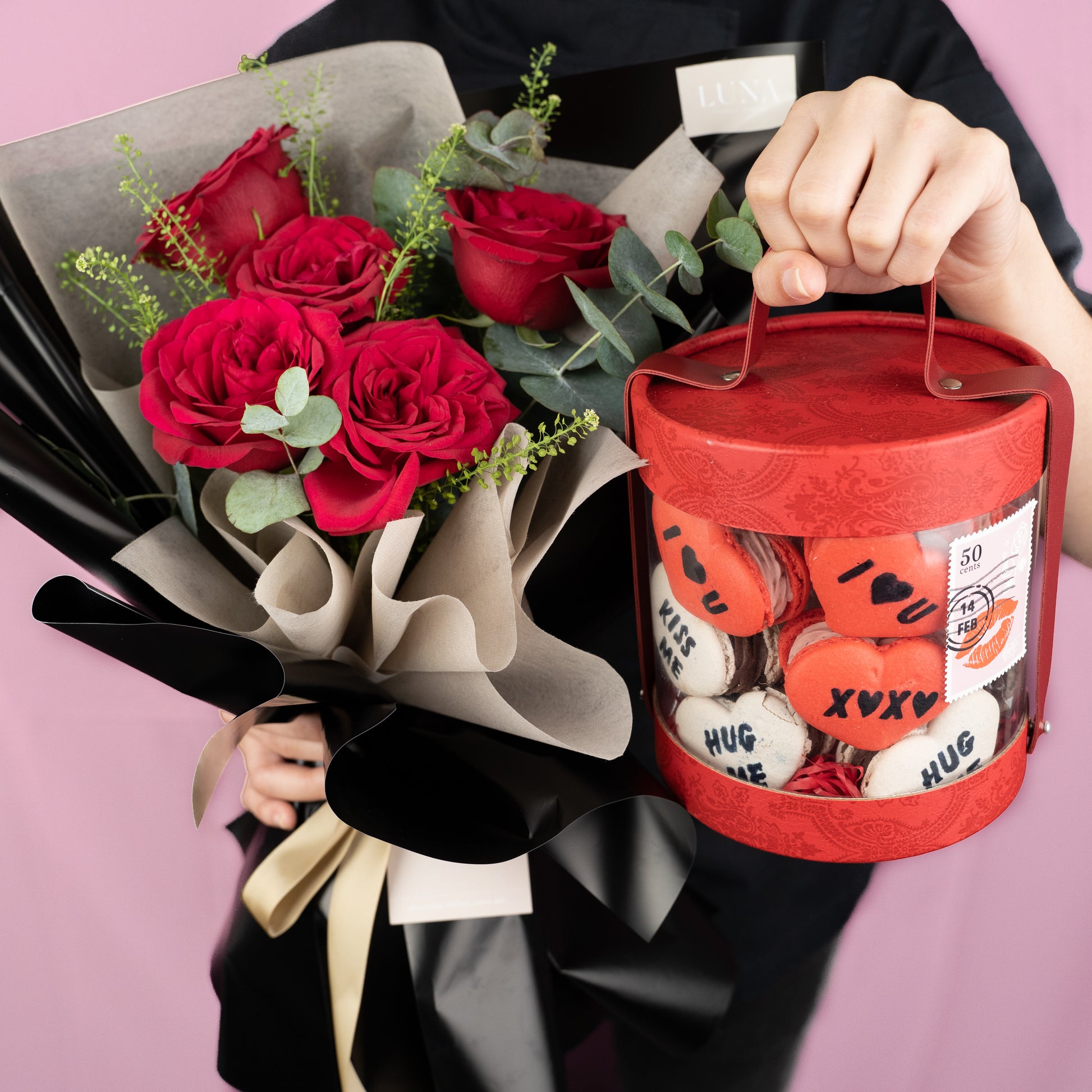 Celebrate your loved ones together with our Elevete Valentine's Bouquet specially curated by Luna. Bundled with our Jar of Hearts that includes the following limited edition Valentine's Day Fatcarons: