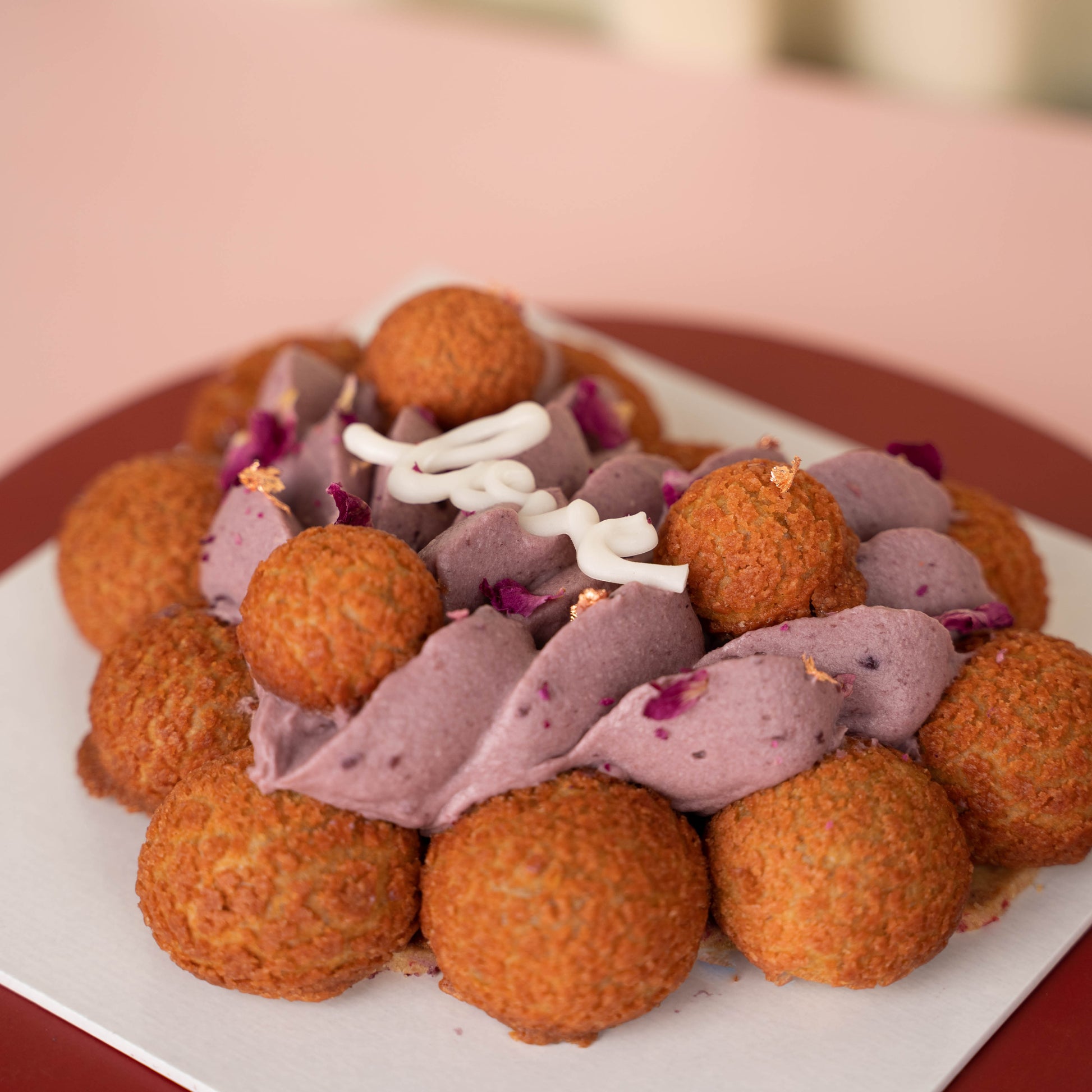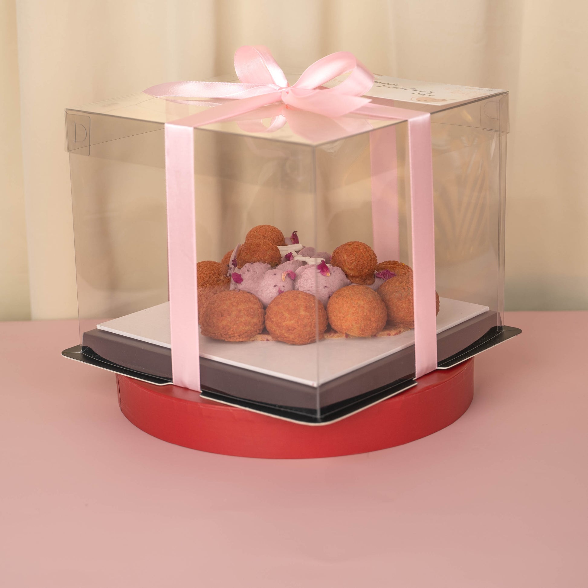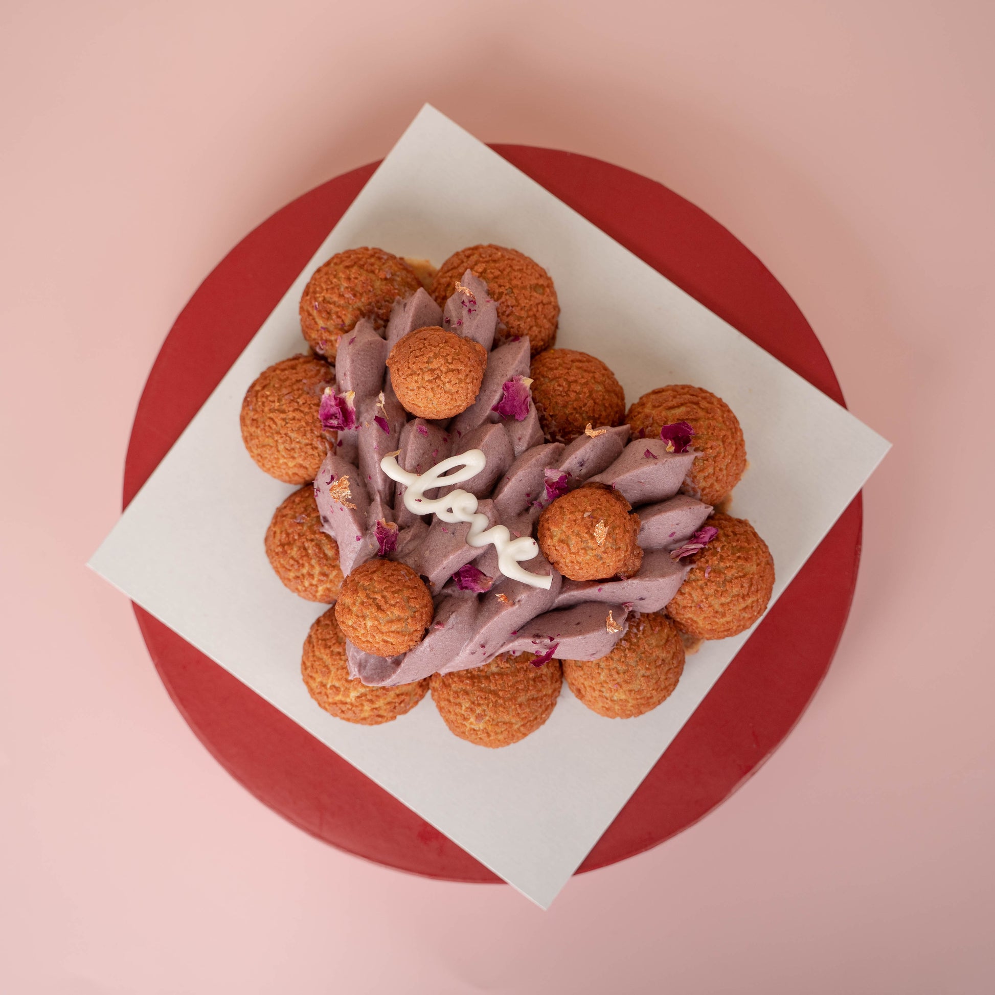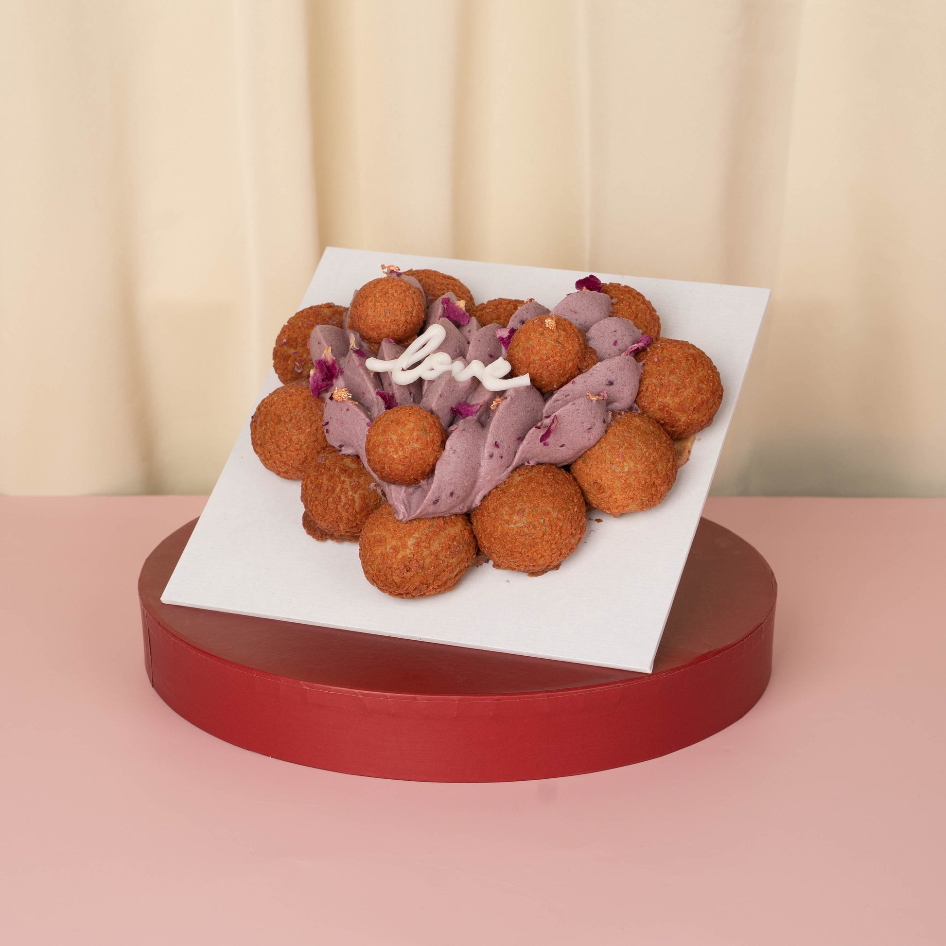 Inspired by the classic St. Honorè cake, a heart shaped raspberry almond crumble base is topped with a sweet and tangy jelly-like red berry coulis and delicately finished with a velvety red berries infused mascarpone cream surrounded with bite-sized red berries cream choux.