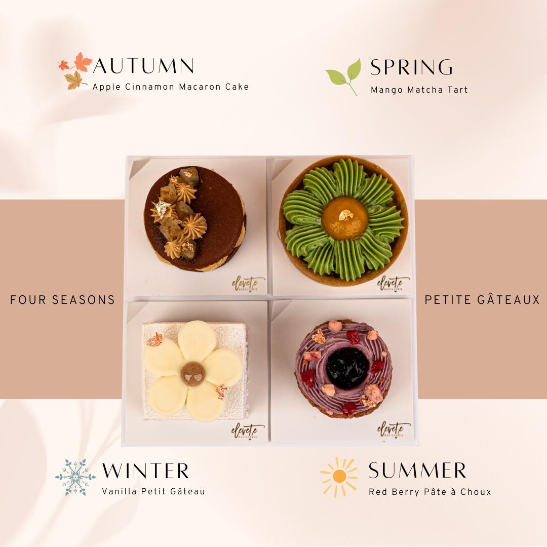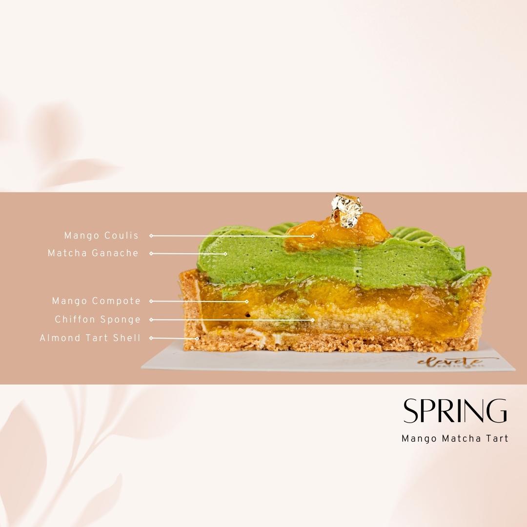 Continue your journey with Spring, a tart with mellow grassy notes and touch of bitterness from the matcha ganache, paired with a refreshing mango compote brings the perfect balance of fruity and earthy with just the right amount of sweetness.