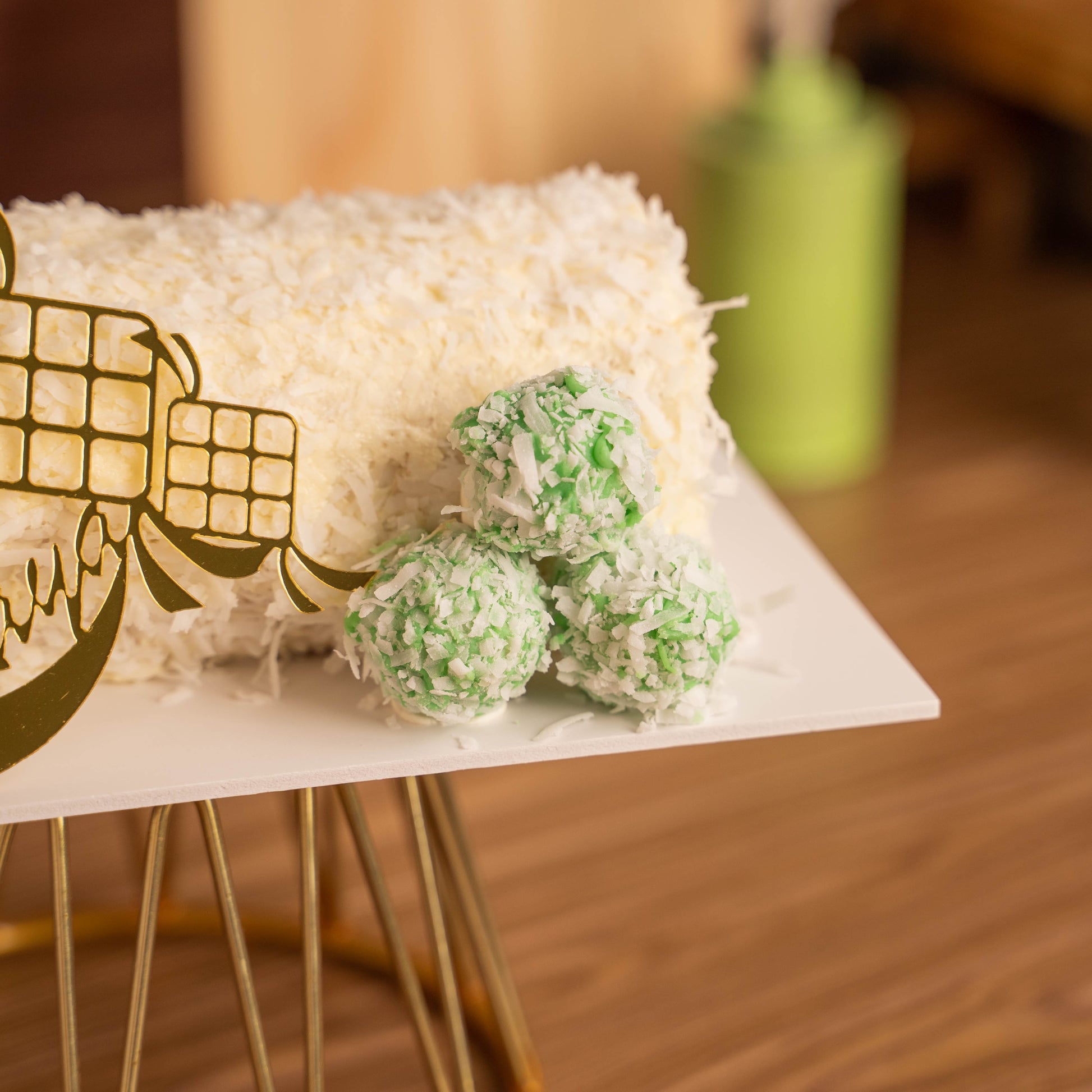 A light and fresh pandan chiffon sponge roll, coated with Hawaiian coconut flakes garnished with handmade chocolate truffles. Bite into the Swiss Meringue Coconut Buttercream and witness the burst of sweetness from the Gula Melaka Syrup.