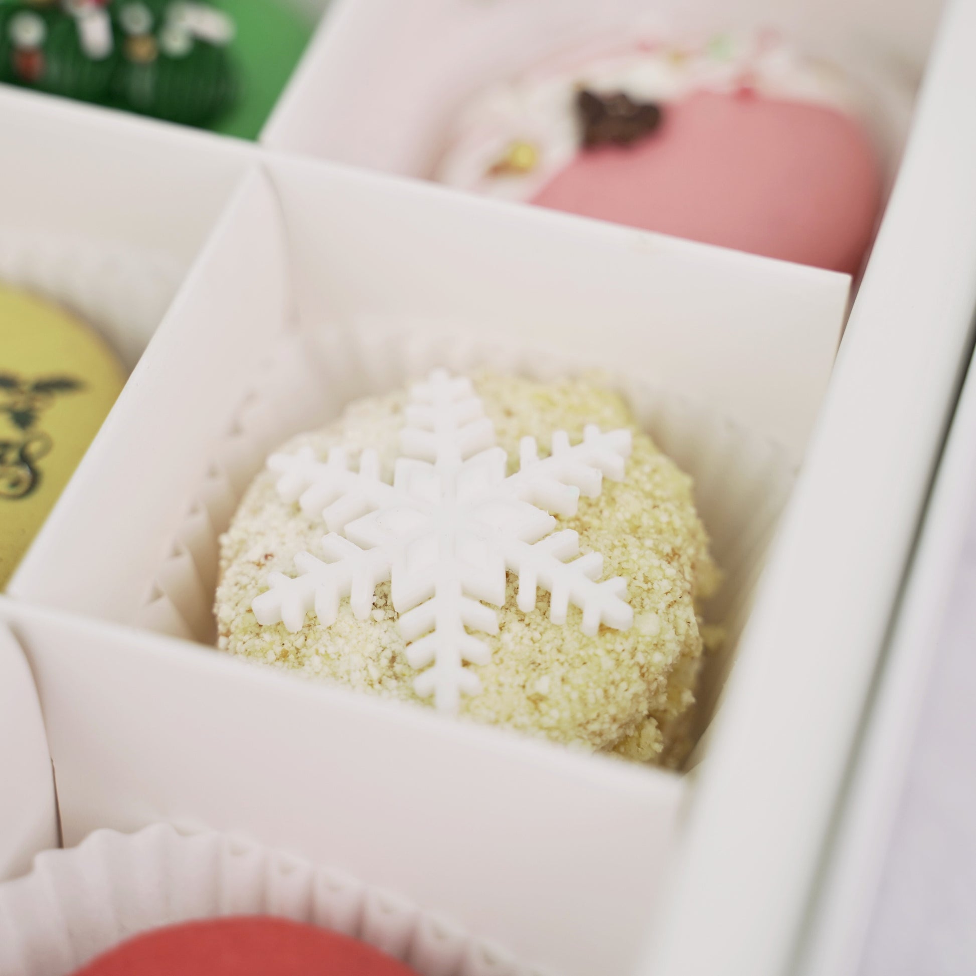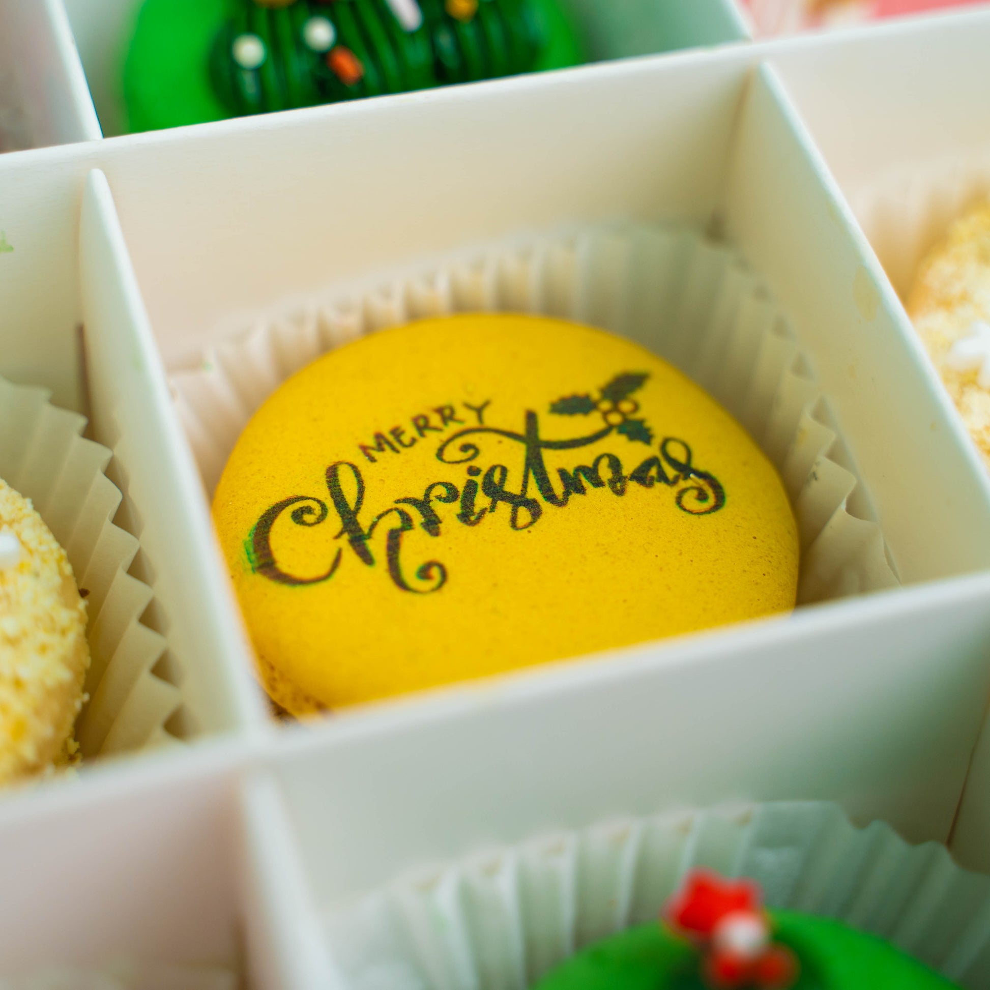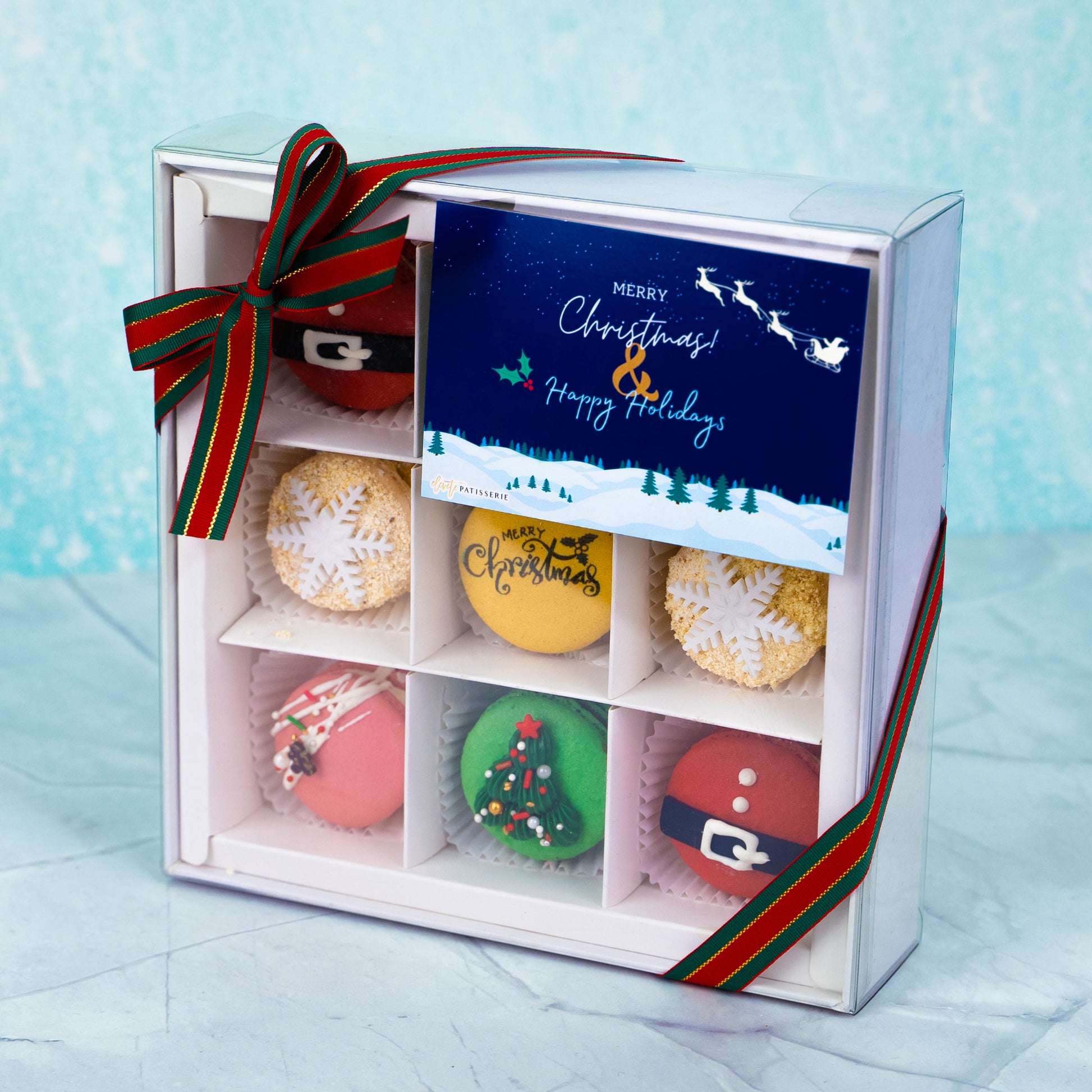 Our selection of tantalizing treats includes six exquisite macarons, all with unique flavors and colors, each one a delightful surprise.