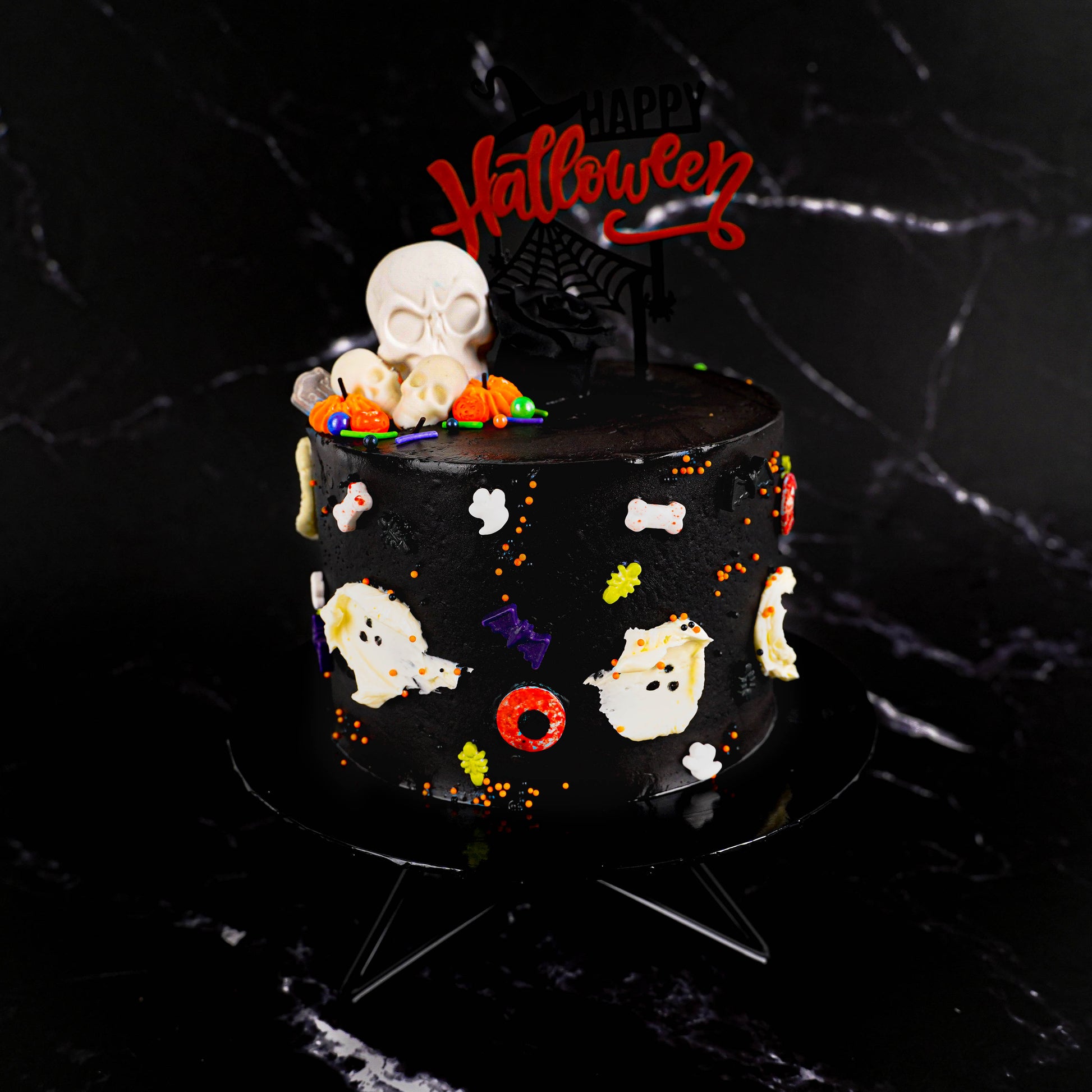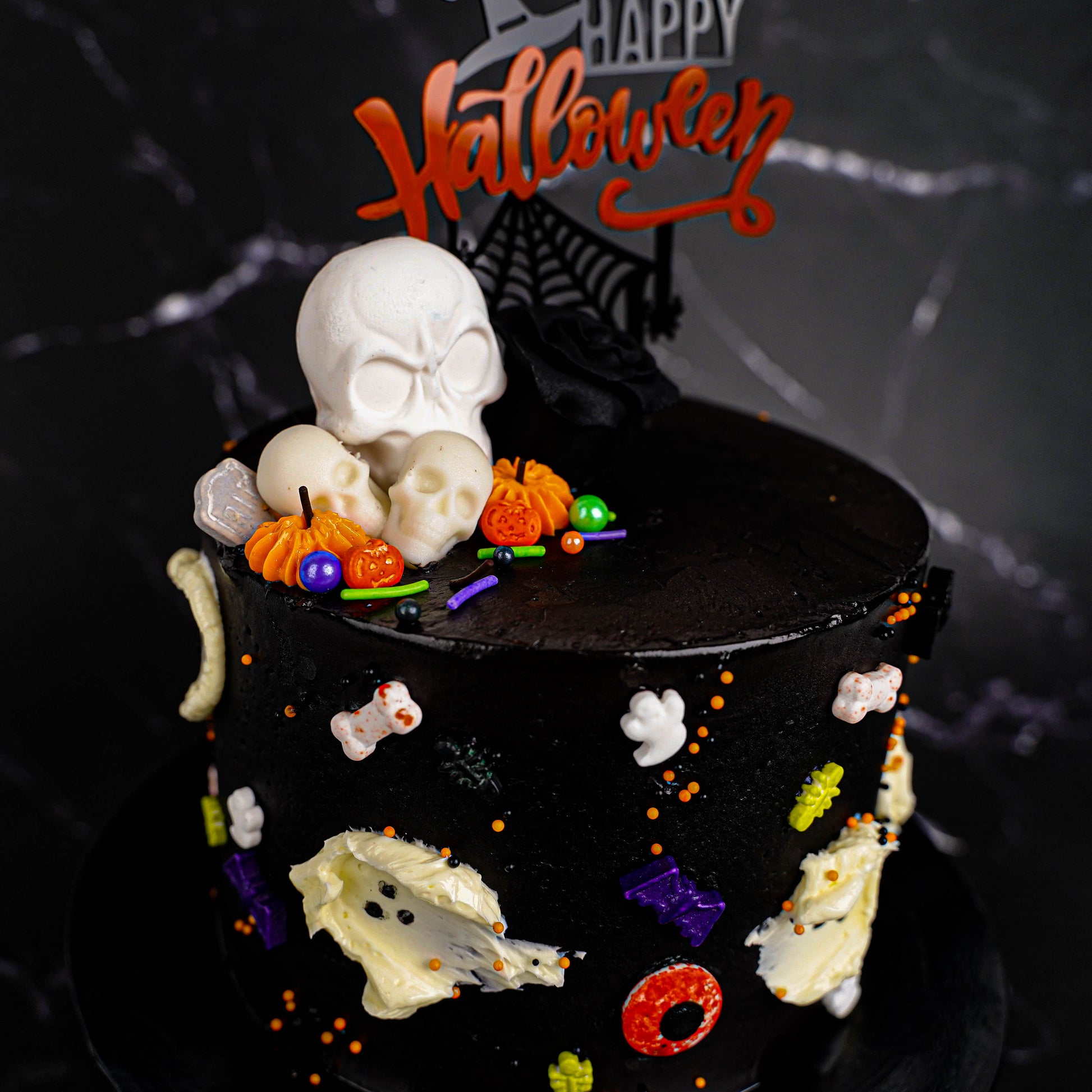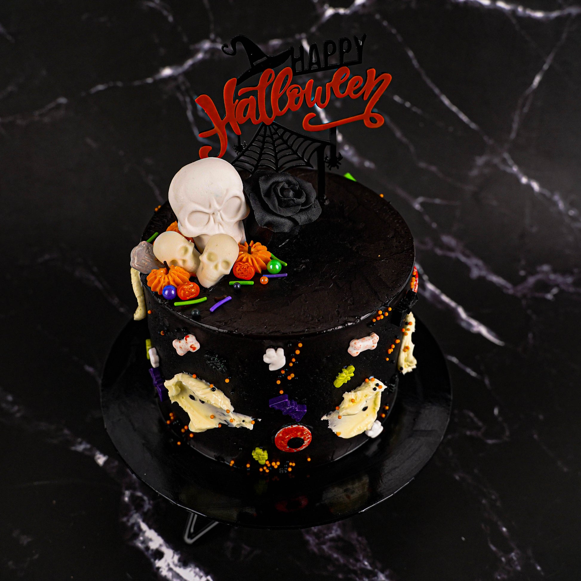 The Halloween Skull Cake is a Salted Caramel Chocolate Cake, the brand’s popular flavour. It is layered with homemade salted caramel sauce that will envelope your taste bud with a delicate balance of sweet and savoury taste. The cake is covered with Callebaut Dark Chocolate, decorated with halloween decorations in icing and chocolates.