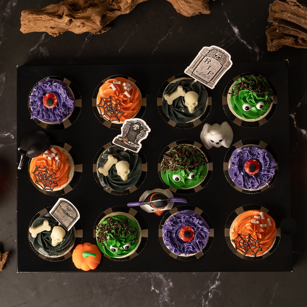 Brace yourself with frightfully fun Halloween treat! Our Trick or Treat Cupcakes are a delightful surprise for anyone who dares to take a bite. These cupcakes are decorated with spooky Halloween themes like tombstones, spider web, bone, spooky eyes and are topped with our Lemon Poppyseed.