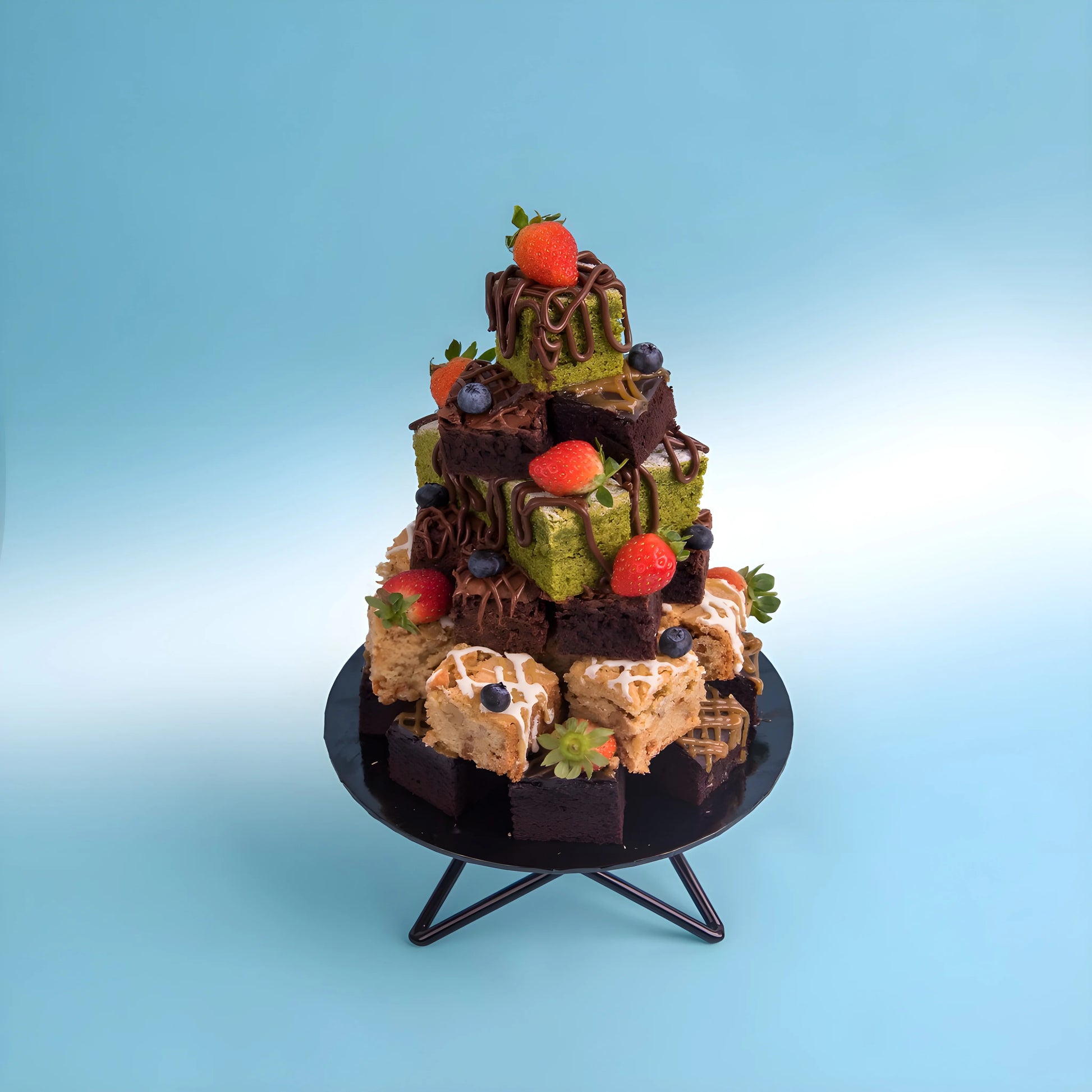Standing tall at 8 inches of height, 36 bite-sized blondies & brownies are stacked, and adorned with fresh strawberries and blueberries finished with chocolate sauce & caramel drizzle.