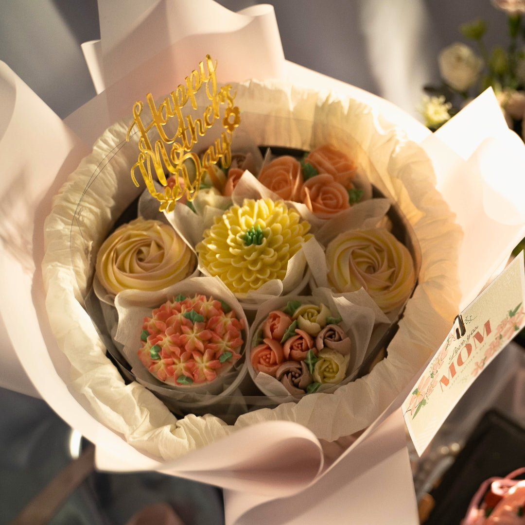 Each cupcake is then artfully piped to resemble fresh blooms and wrapped with a graceful satin bow – harmonized into an edible bouquet that speaks love, elegance, and appreciation in every bite.